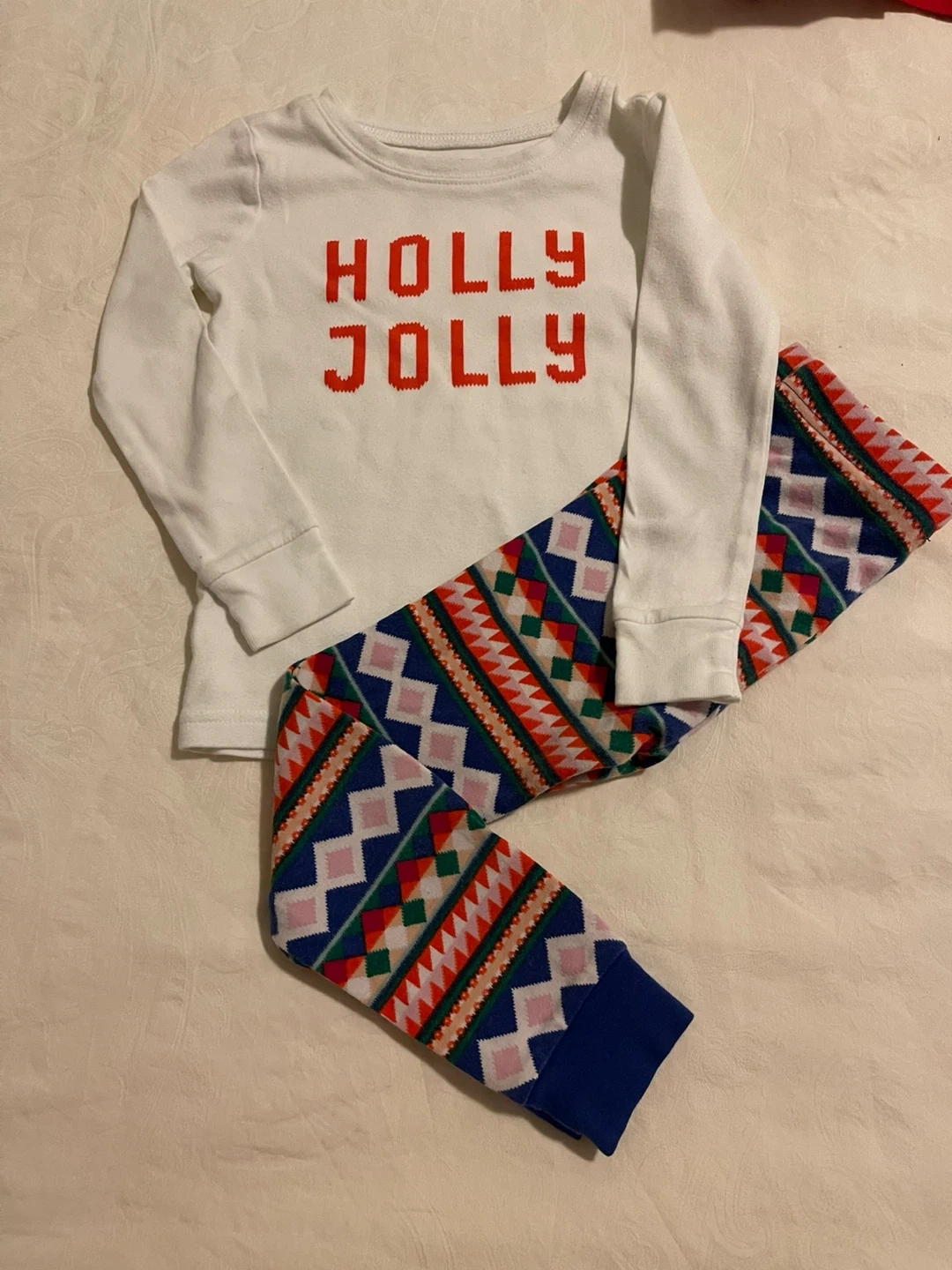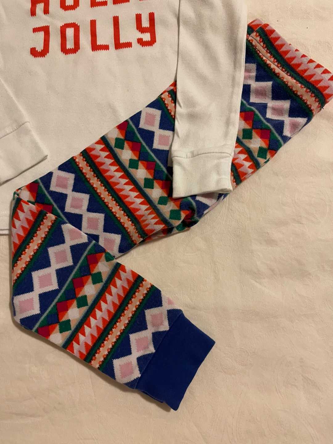 Festive pajama set with 'Holly Jolly' top and colorful patterned pants. Perfect for cozy nights.