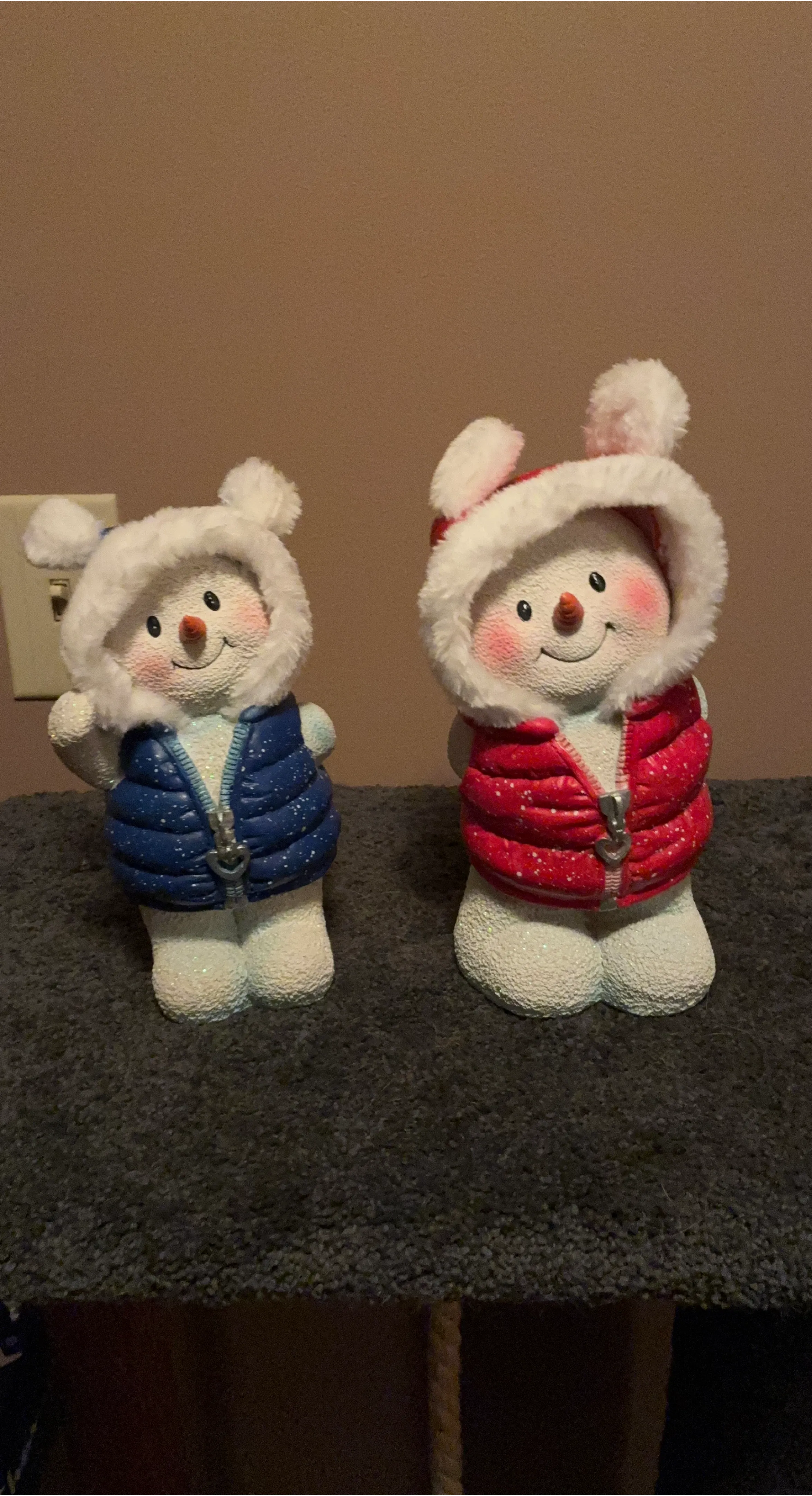 Two adorable snowman figurines, one in a red vest and the other in a blue vest! They're perfect for adding a touch of winter charm to your home
