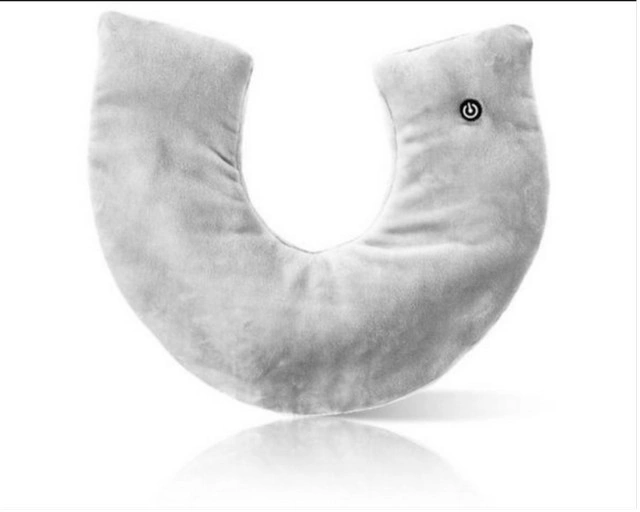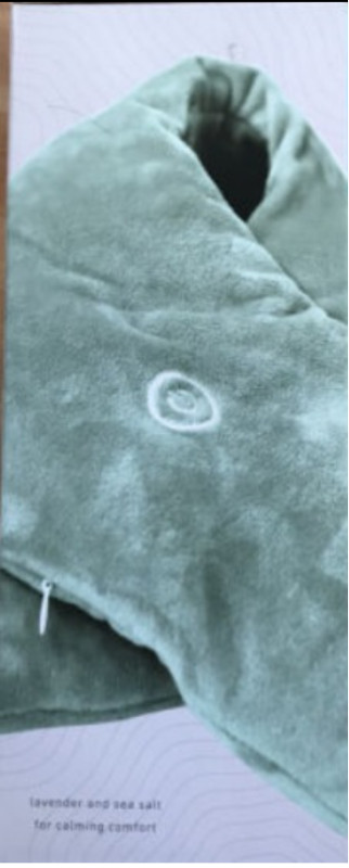 New in box. This shoulder massaging neck wrap by Sharper Image is the ideal product to help you relax and release tension. It uses vibrating massage waves and the therapeutic scents of the removable lavender inserts. The sea salt filled wrap is microwave friendly and can be heated. Requires 2 AA batteries (not included).