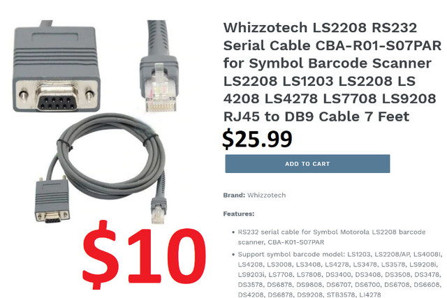LS2208 RS232 Serial Cable Symbol Barcode Scanner