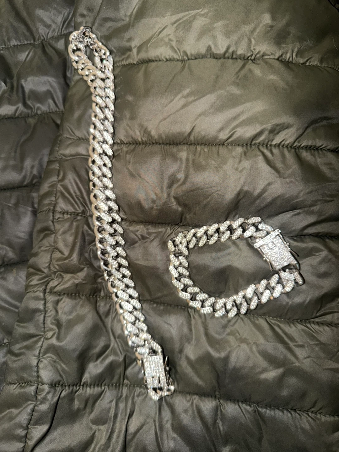 Selling a stylish Cuban link chain and matching bracelet set. The set features a shiny silver color and is in great condition. It comes with its original box, perfect for storage or gifting. Add some bling to your style!
