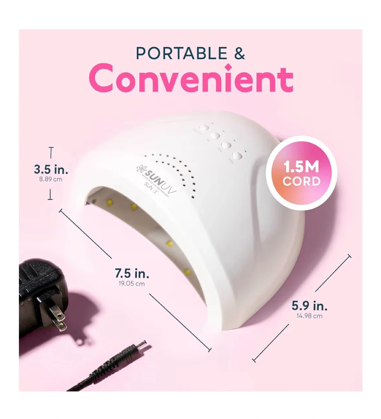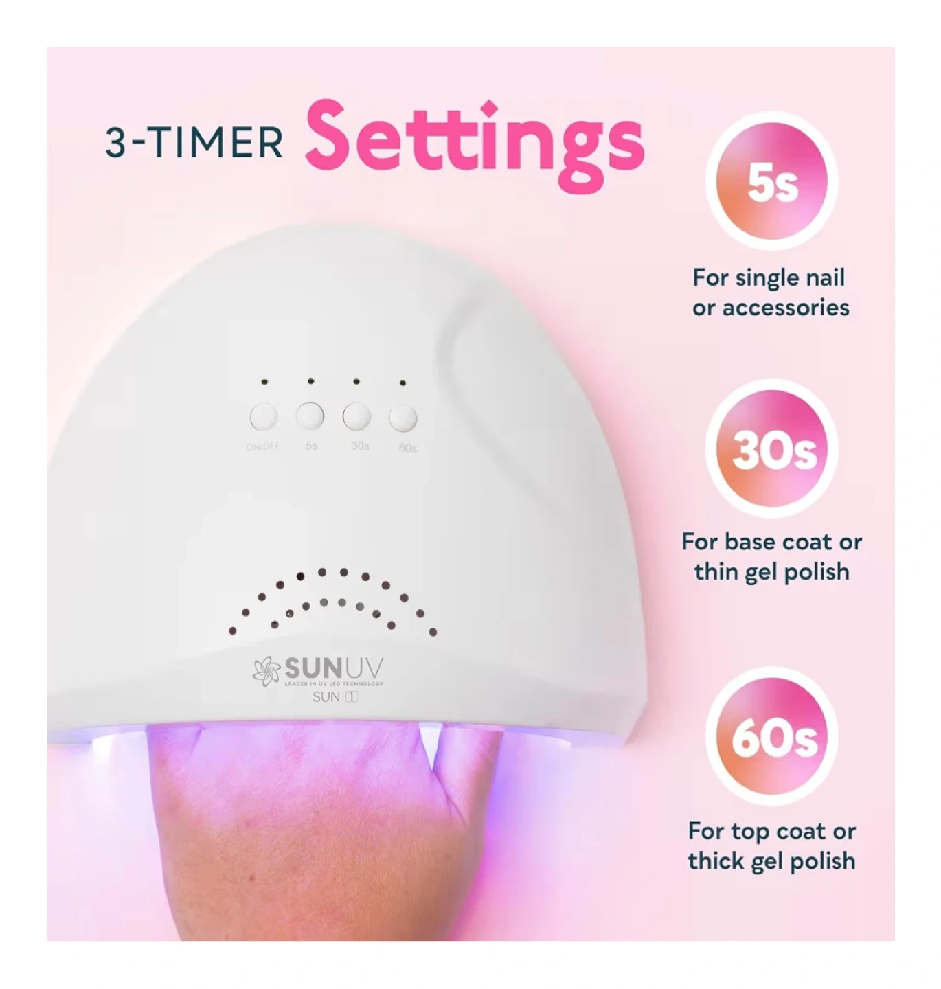 This SUNUV SUN1 nail lamp offers salon quality with 3 timer settings: 5s, 30s, and 60s. It features a durable white plastic construction and comes with a 1.5m cord. The lamp is designed for professional and at-home use with its consistent professional results.