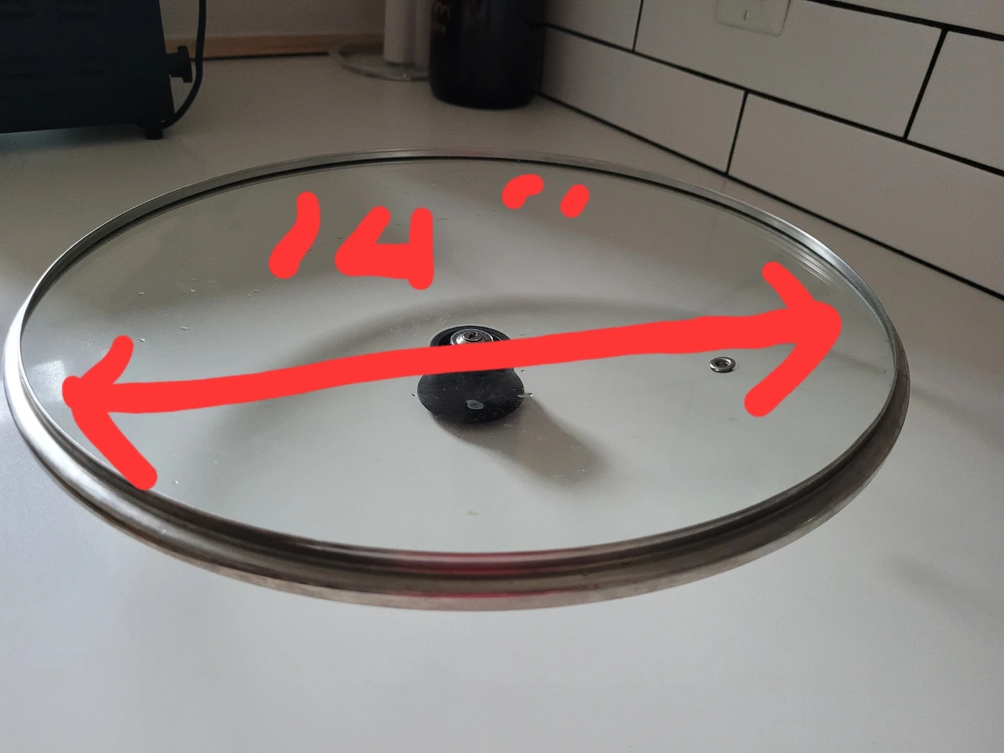 This is a T-fal glass pot lid. It measures 14 ins (35.5cm) across. It has a metal rim and a black plastic handle.