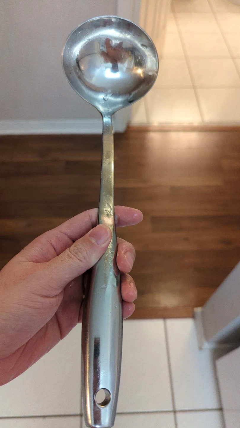 Selling a stainless steel ladle in used condition. It's perfect for serving soups, stews, and sauces! It has a comfortable handle and a classic design. It's ready to be used in your kitchen.