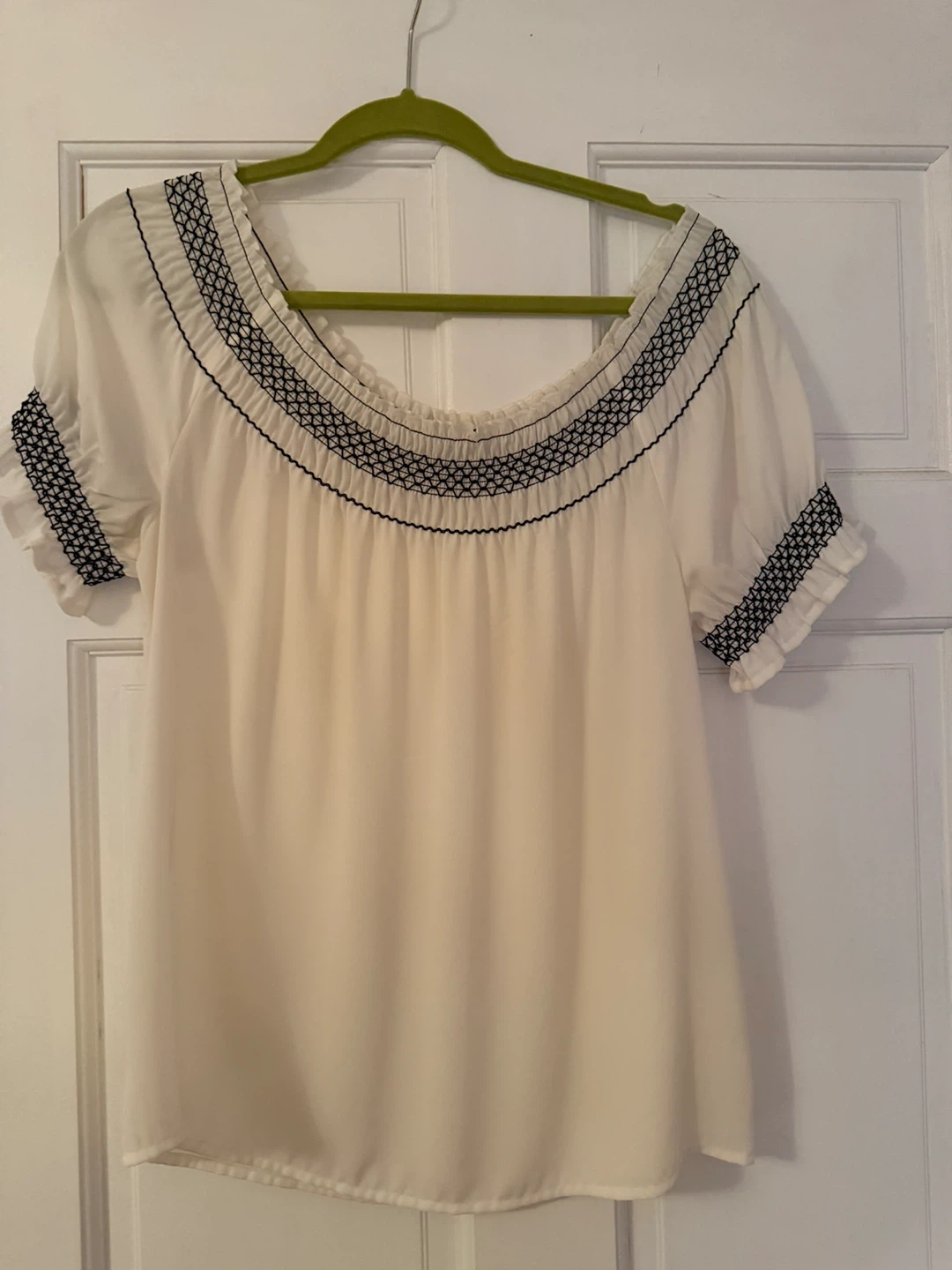 345Selling a cute Express top in size XS! It's a cream color with black detailing around the neckline and sleeves. Great condition and ready for a new home