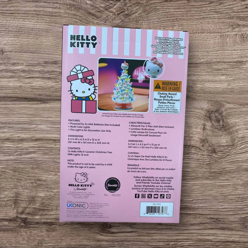 Hello Kitty ceramic Christmas tree with multi-color lights! It stands 12 inches tall and requires 3x AAA batteries. The dimensions are 6.3 in D x 6.3 in W x 12 in H (161 mm W x 161 mm D x 305 mm H). Available for pickup or local delivery!