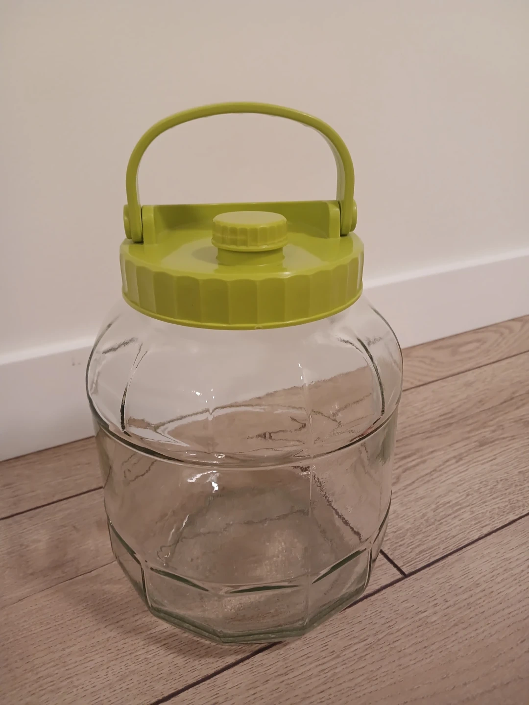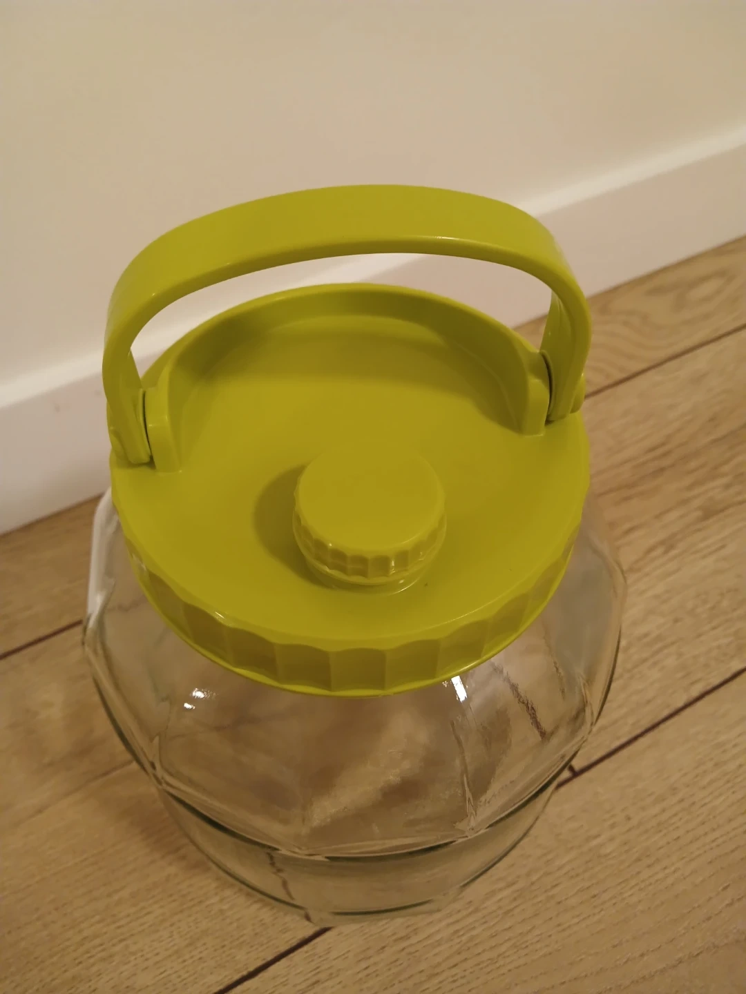 47Selling a glass jar with a bright green lid! It's in great shape and ready for a new home. Perfect for storing dry goods or displaying decorative items. The lid has a convenient handle for easy carrying