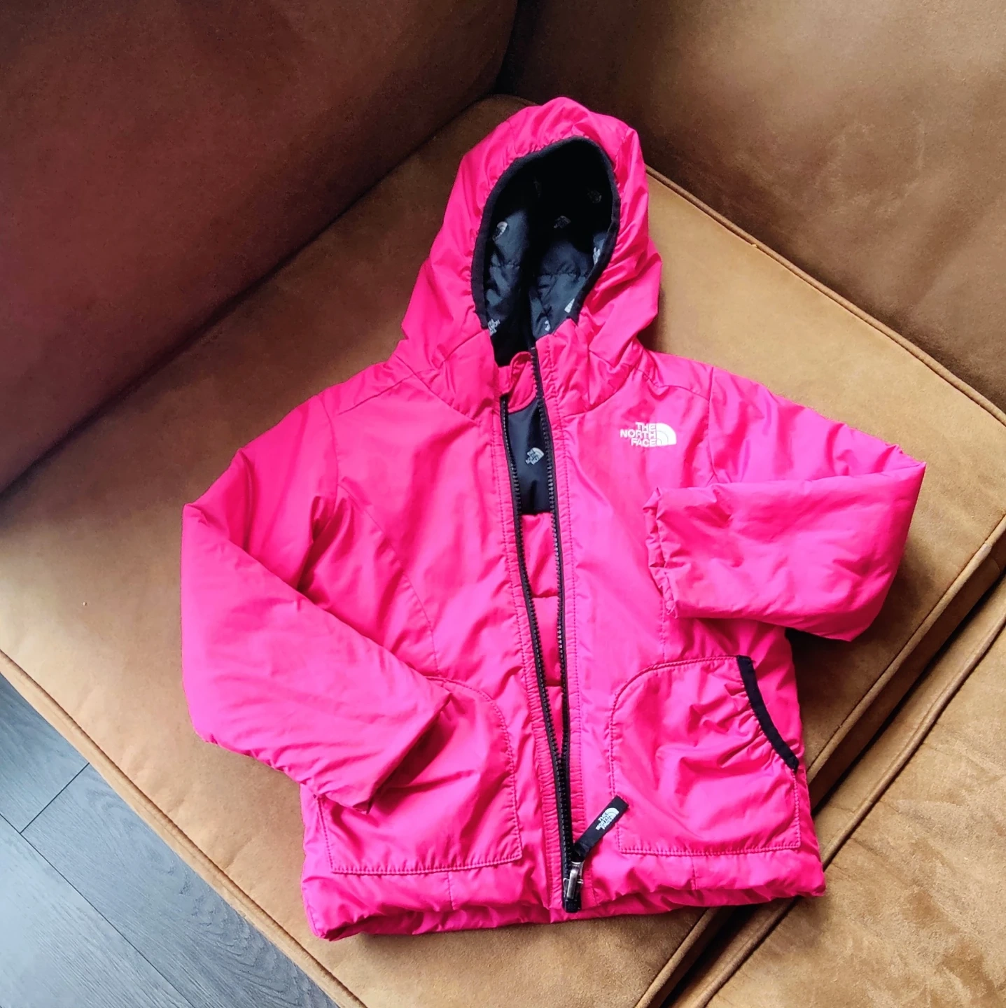 3T .This is a super cute reversible jacket from The North Face! One side is a solid pink colour, and the other is black with a white pattern and pink sleeves. Perfect for keeping your little one warm and stylish!