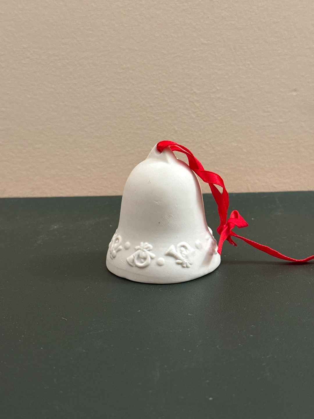 A cute white ceramic bell Christmas ornament. It has a red ribbon for hanging, and a delicate design around the base. Perfect for adding a touch of charm to your home!