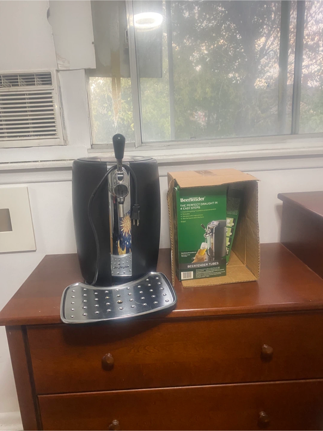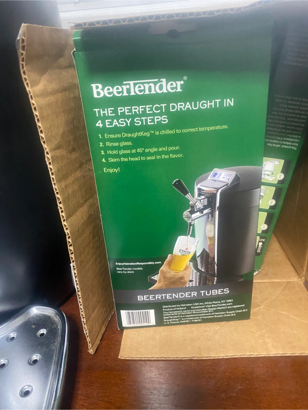 Selling a BeerTender draught beer dispenser! It comes with its original box. Enjoy the perfect draught in 4 easy steps: ensure DraughtKeg is chilled to correct temperature, rinse glass, hold glass at 45° angle and pour, skim the head to seal in the flavor