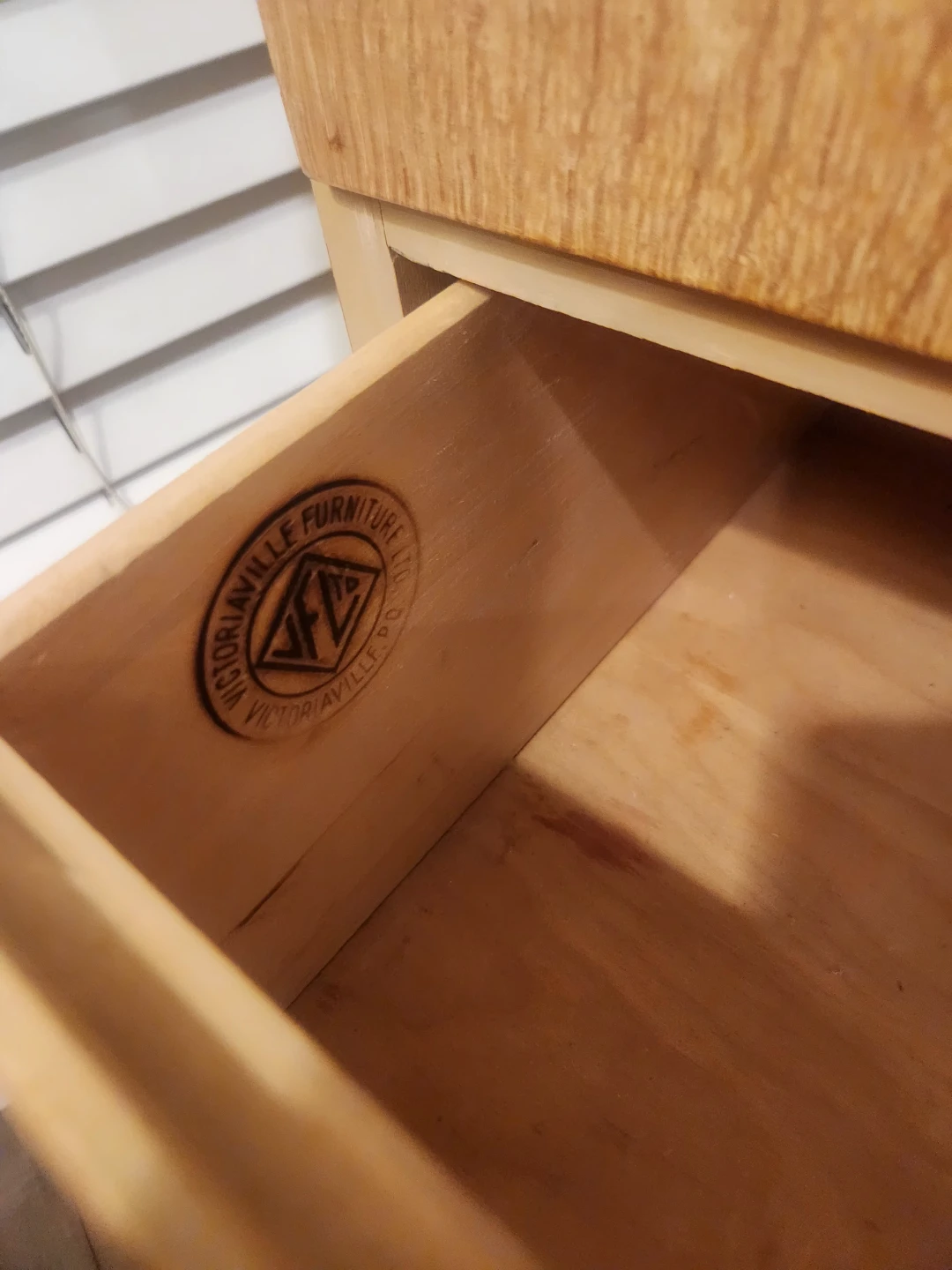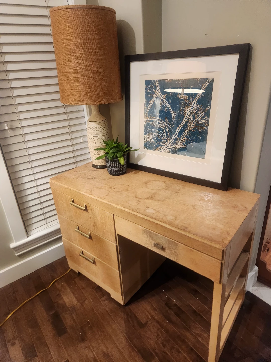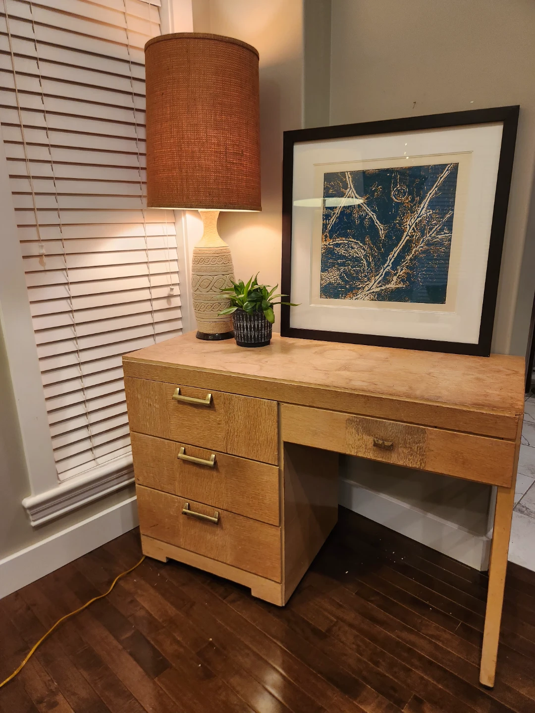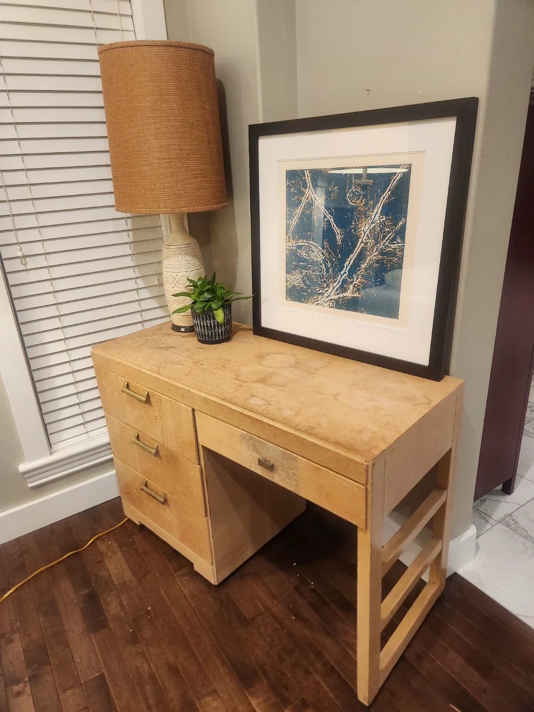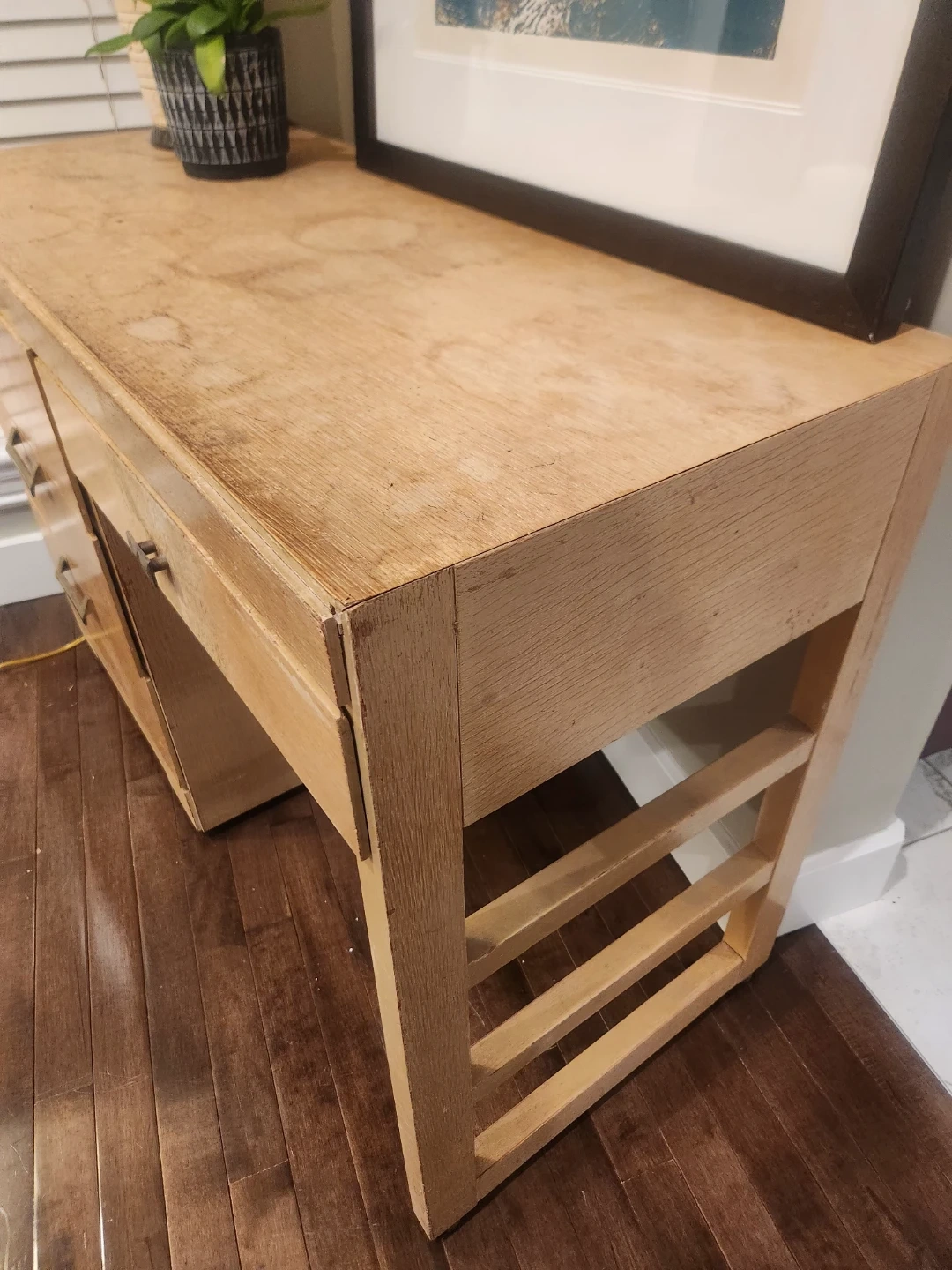 1950's Canadian made wooden desk featuring 4 drawers. Its small space friendly for bedrooms or bachelor suites. The maker Victoriaville Canadian furniture company. We'll constructed and oodles of storage this desk is a steal of a deal! This handsome and handy functional piece of perfect for study space. This light wood piece can be a TV Console, entryway table, side table or a fantastic option for extra storage and height for your plant babies!