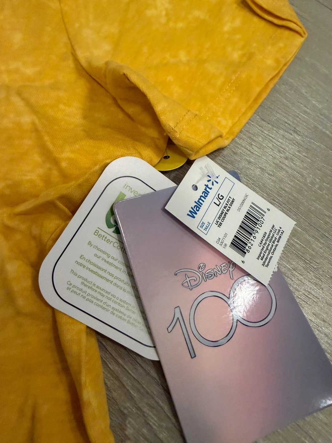 This is a new Disney 100 Donald Duck graphic tee in size large. The shirt is yellow with a graphic of Donald Duck on the front