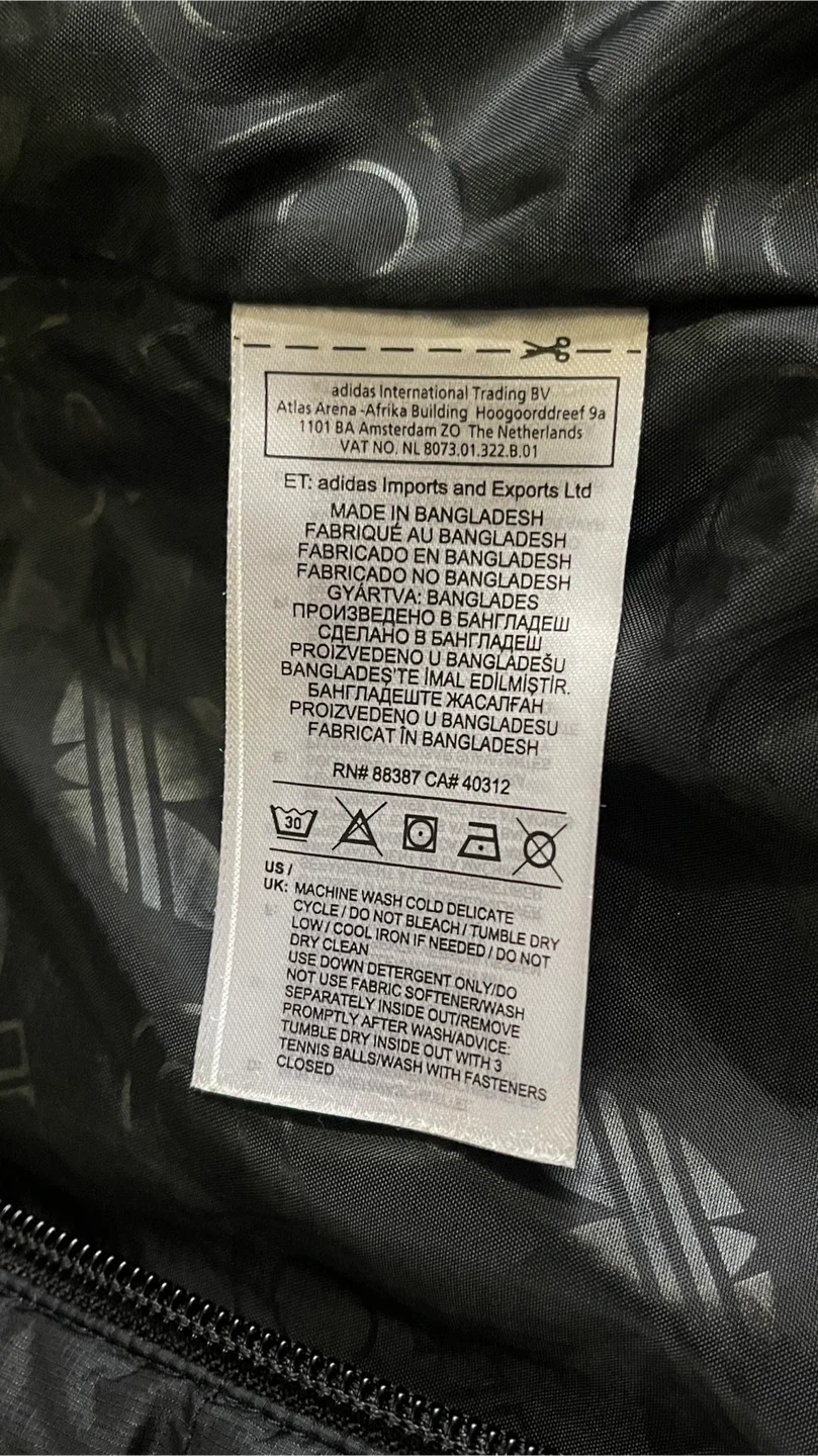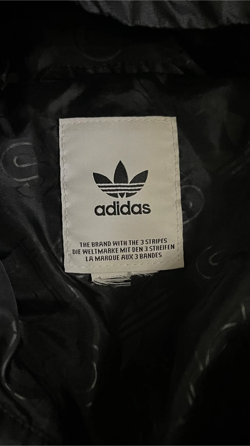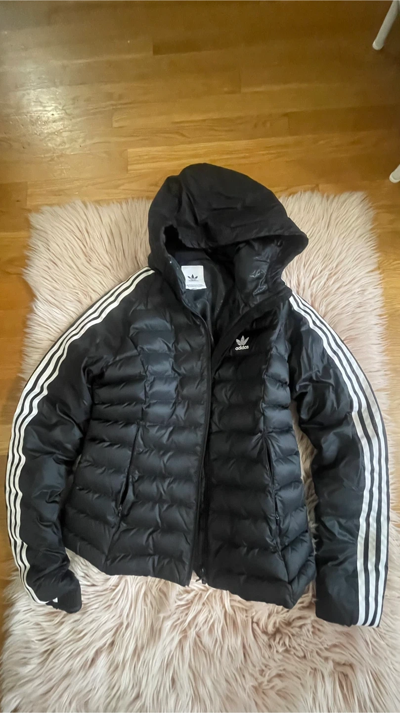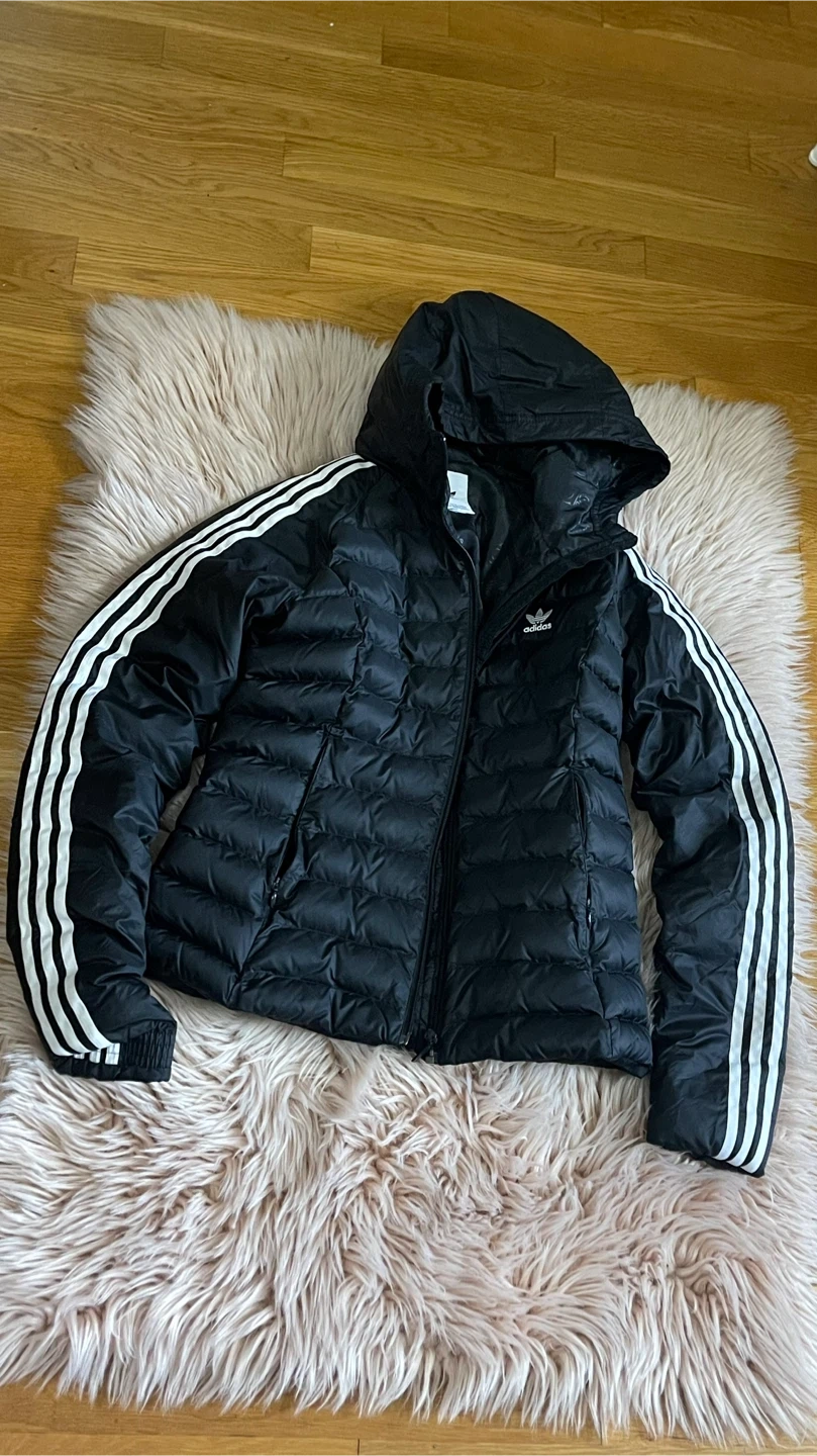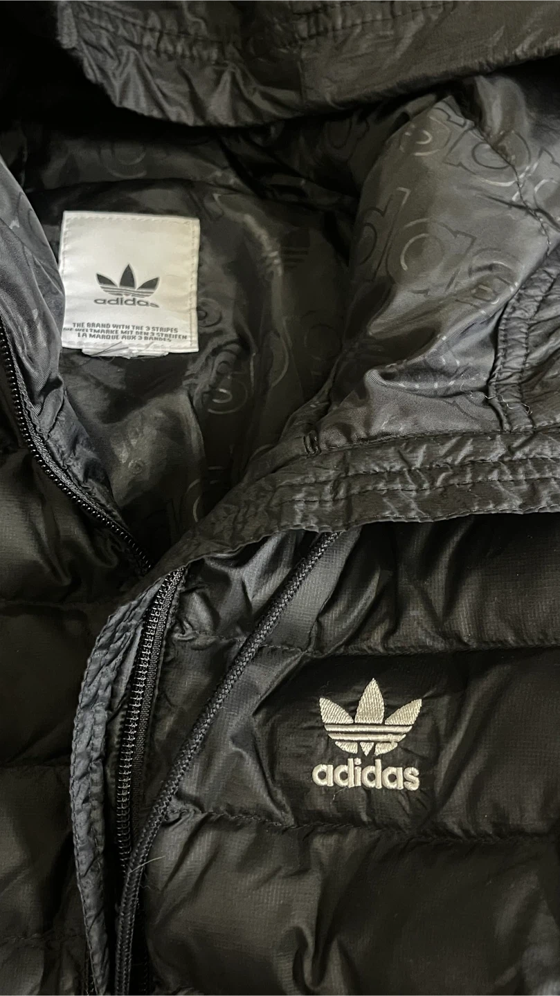 Here's a stylish black Adidas padded jacket, perfect for staying warm! It features the classic Adidas three-stripe design on the sleeves. The jacket is in great condition and ready for a new home