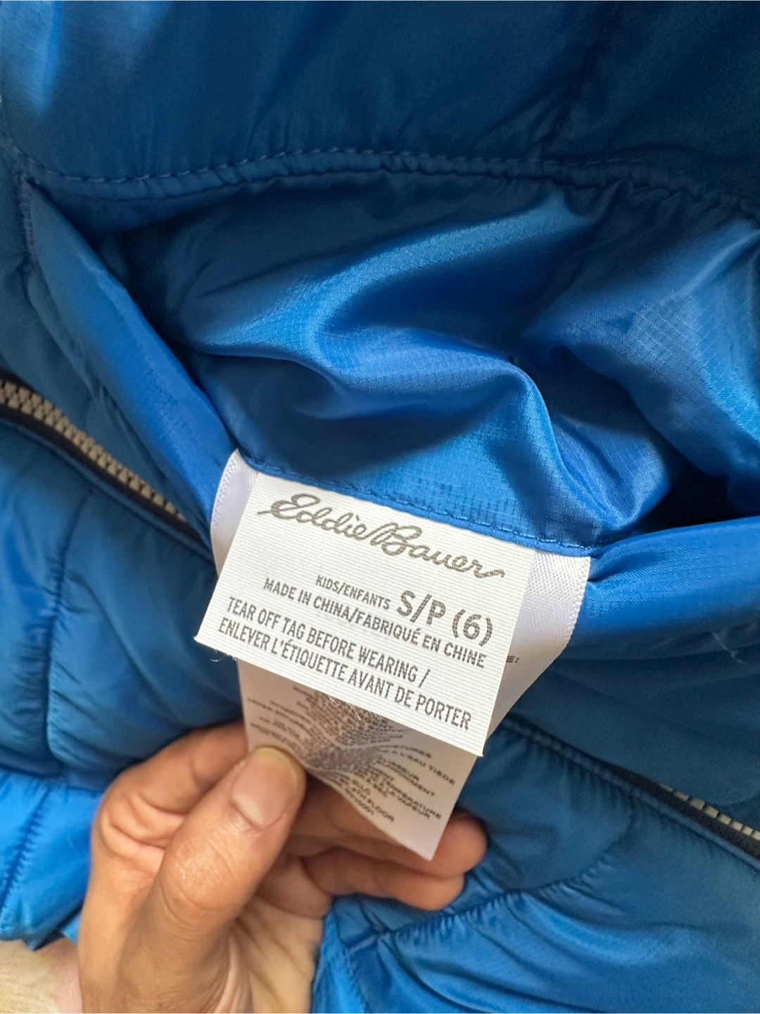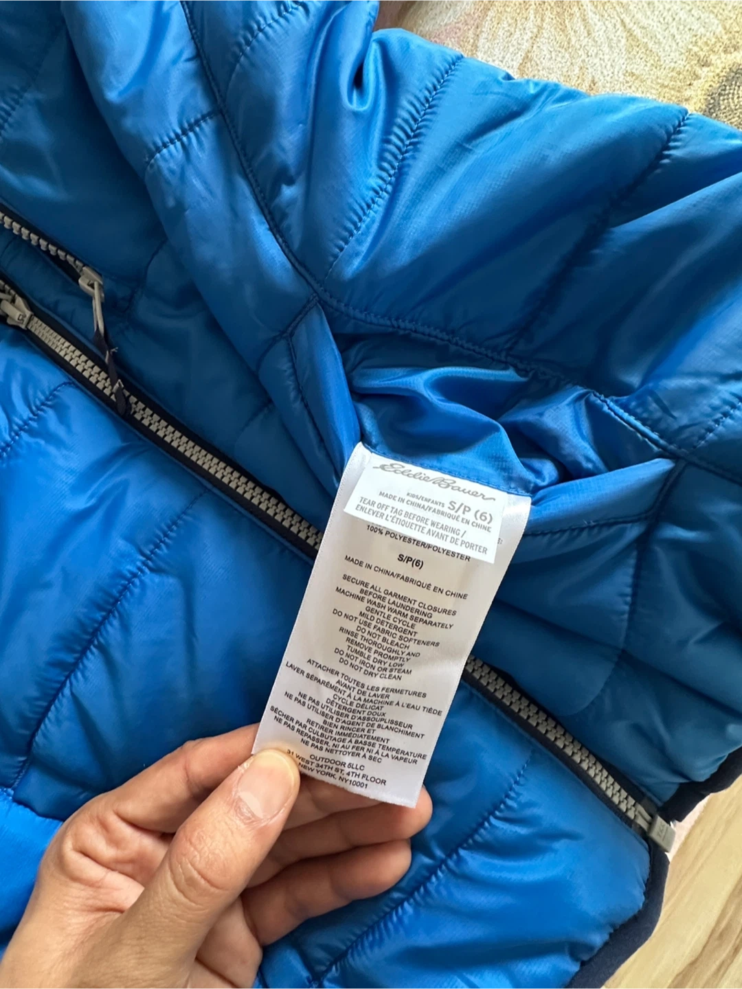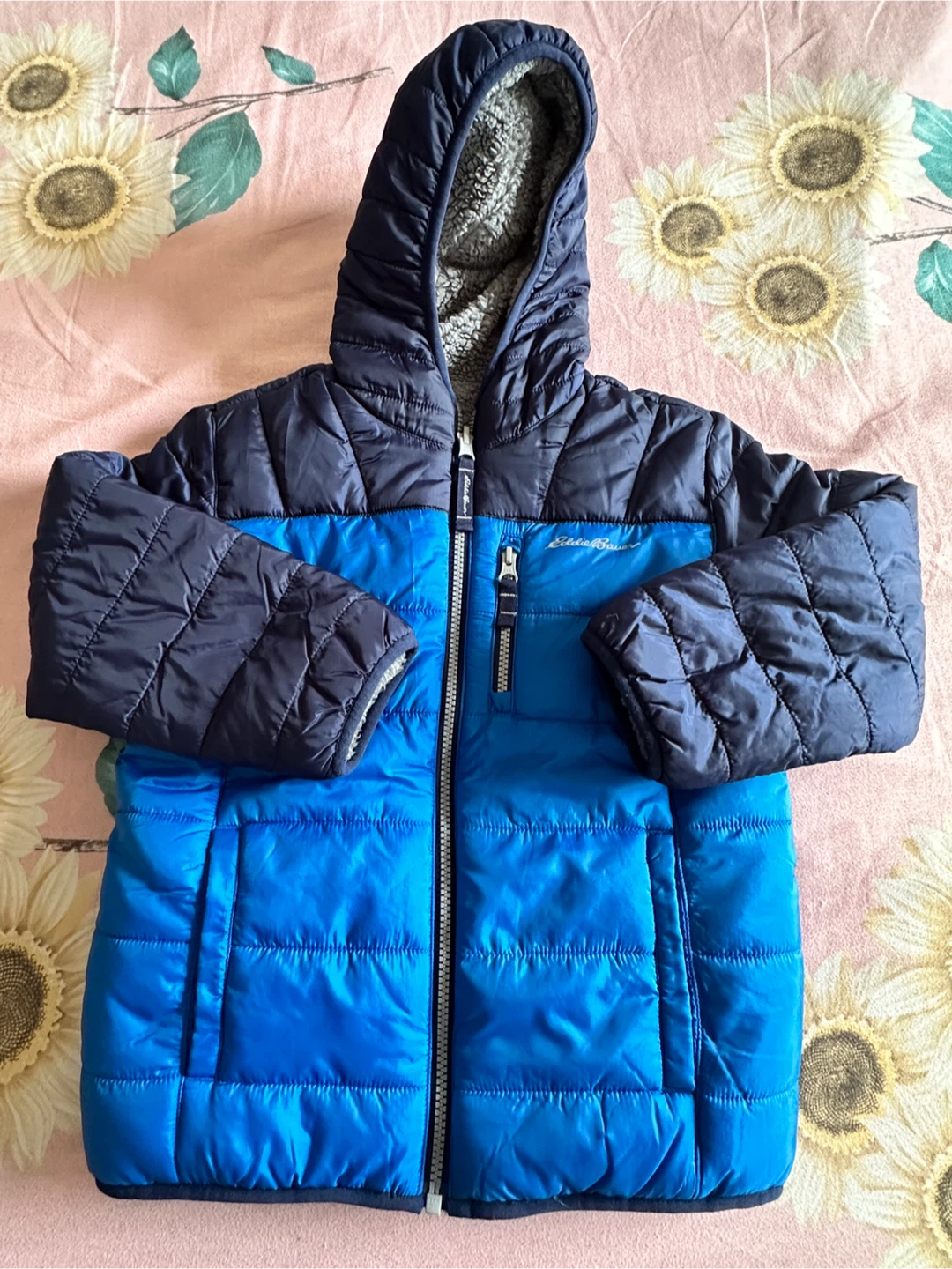Selling a cute Eddie Bauer kids puffer jacket! It's a size S (6) and features a stylish blue and navy colour block design. The inside is lined with a cozy grey fleece material, perfect for keeping your little one warm during those chilly days