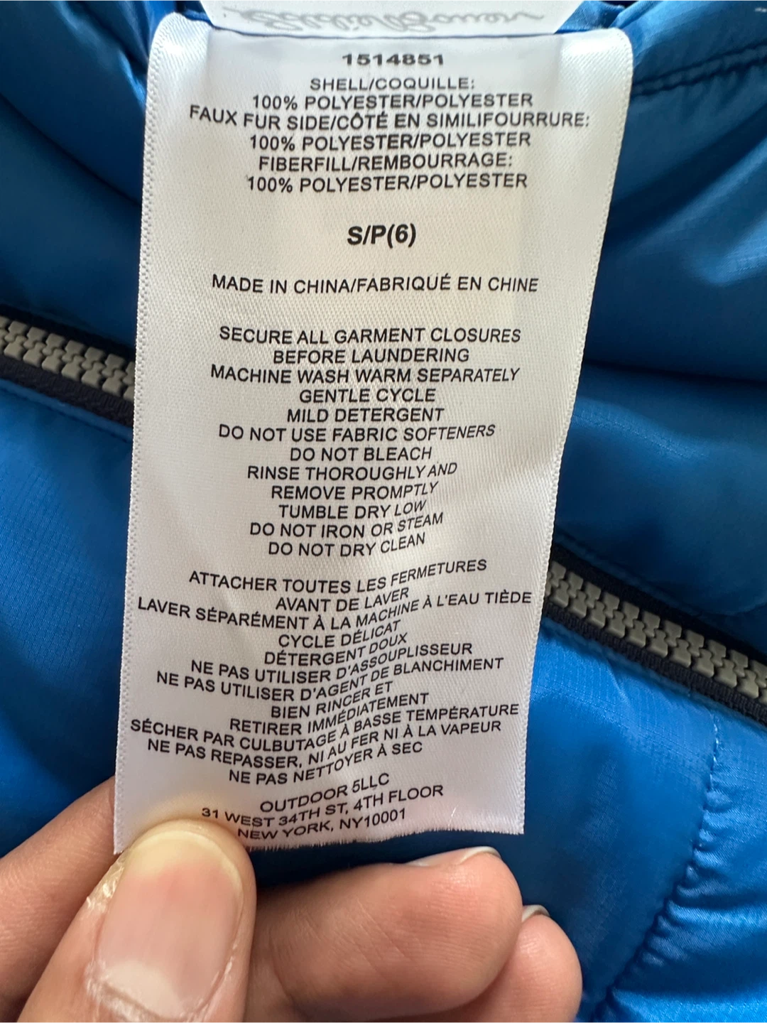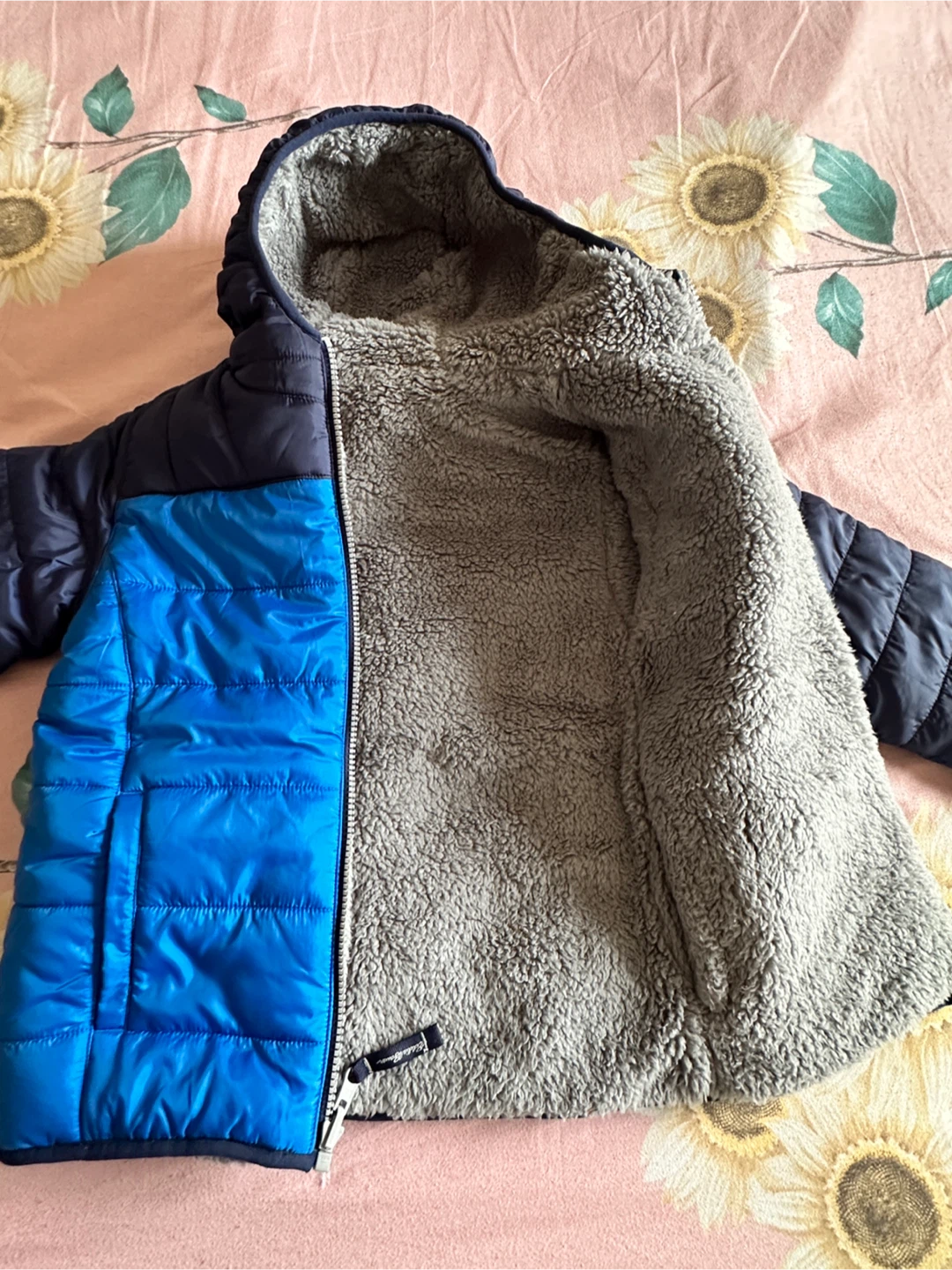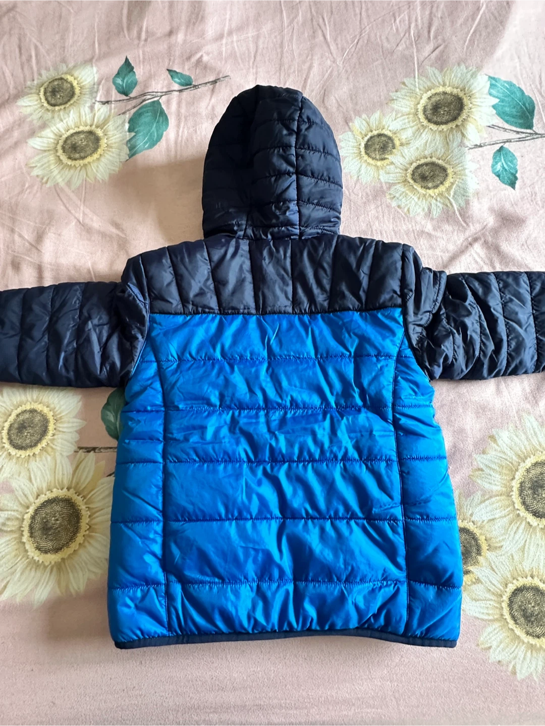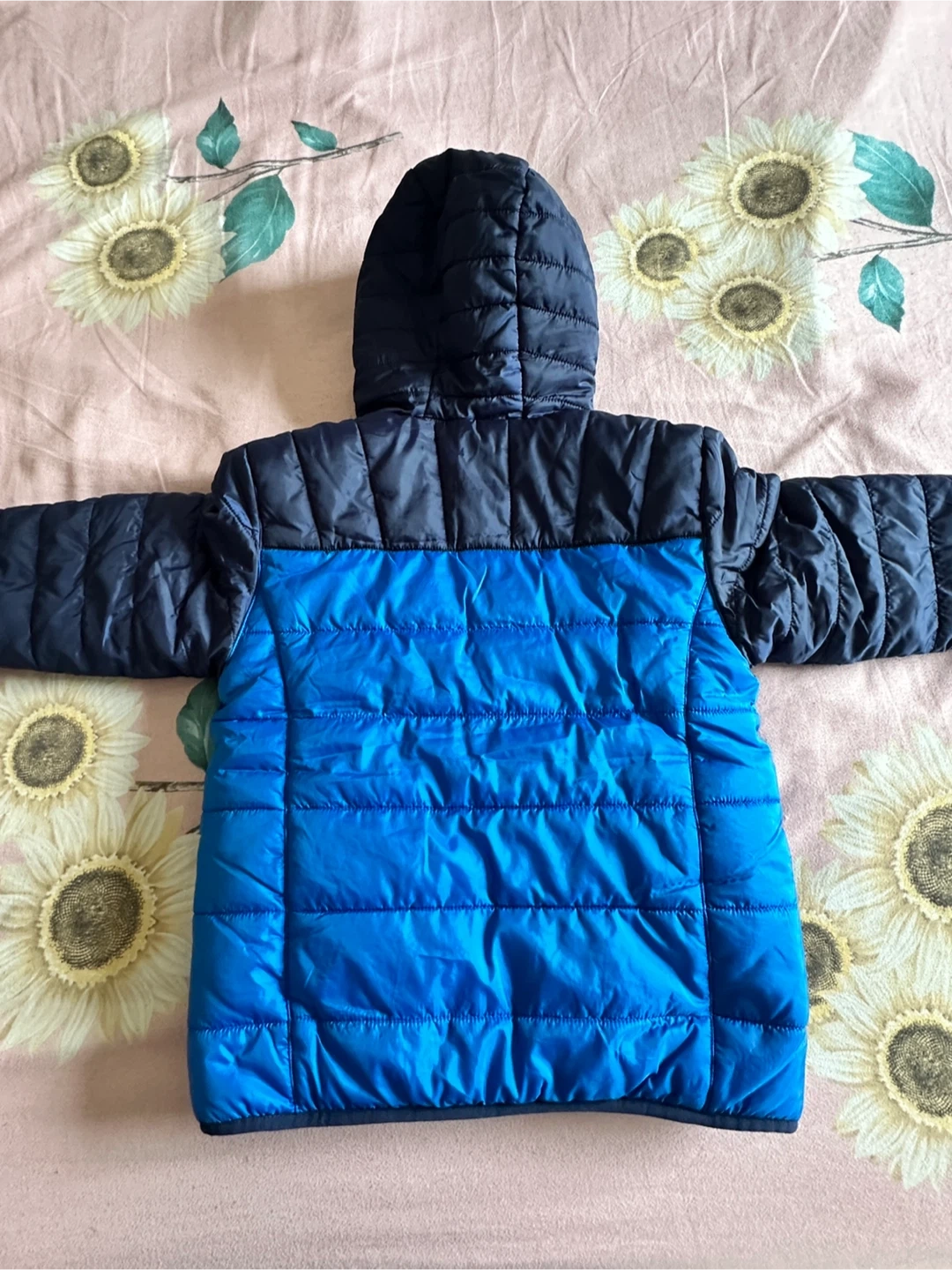Selling a cute Eddie Bauer kids puffer jacket! It's a size S (6) and features a stylish blue and navy colour block design. The inside is lined with a cozy grey fleece material, perfect for keeping your little one warm during those chilly days