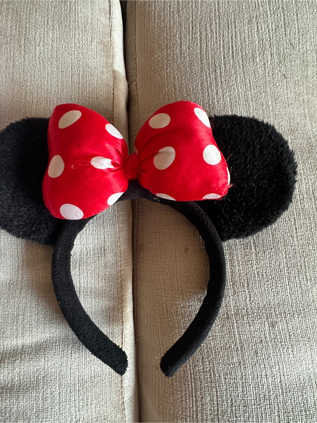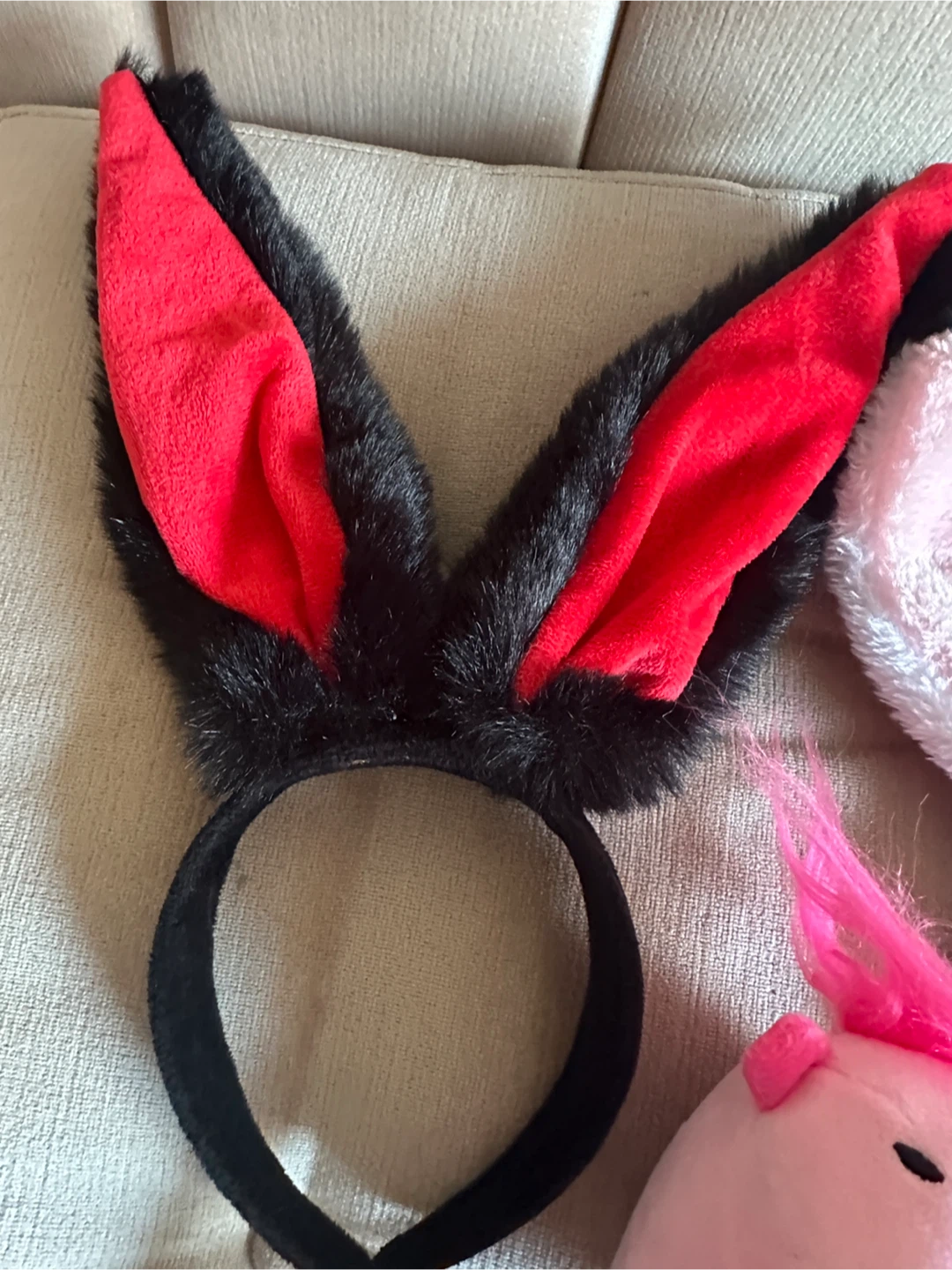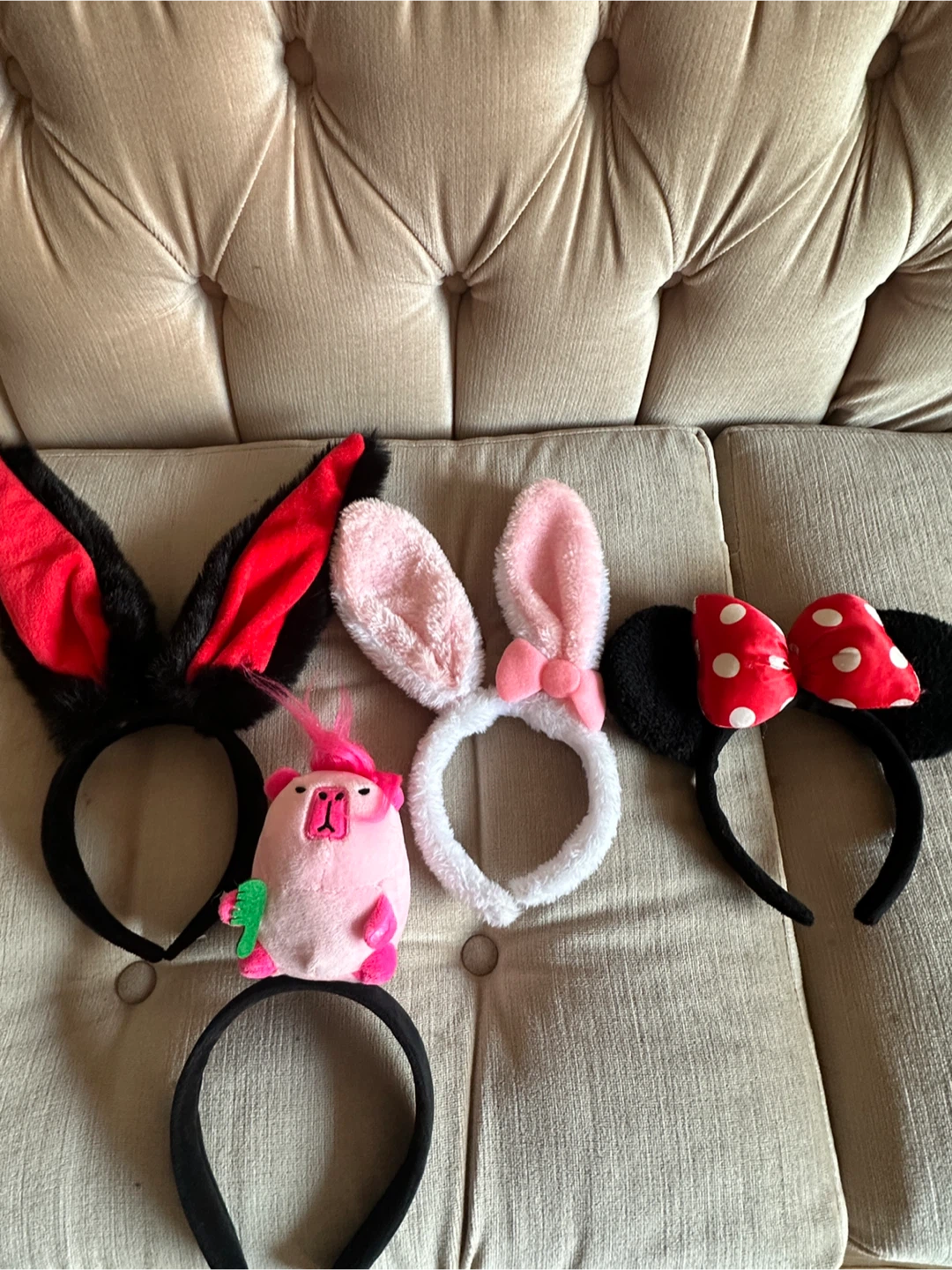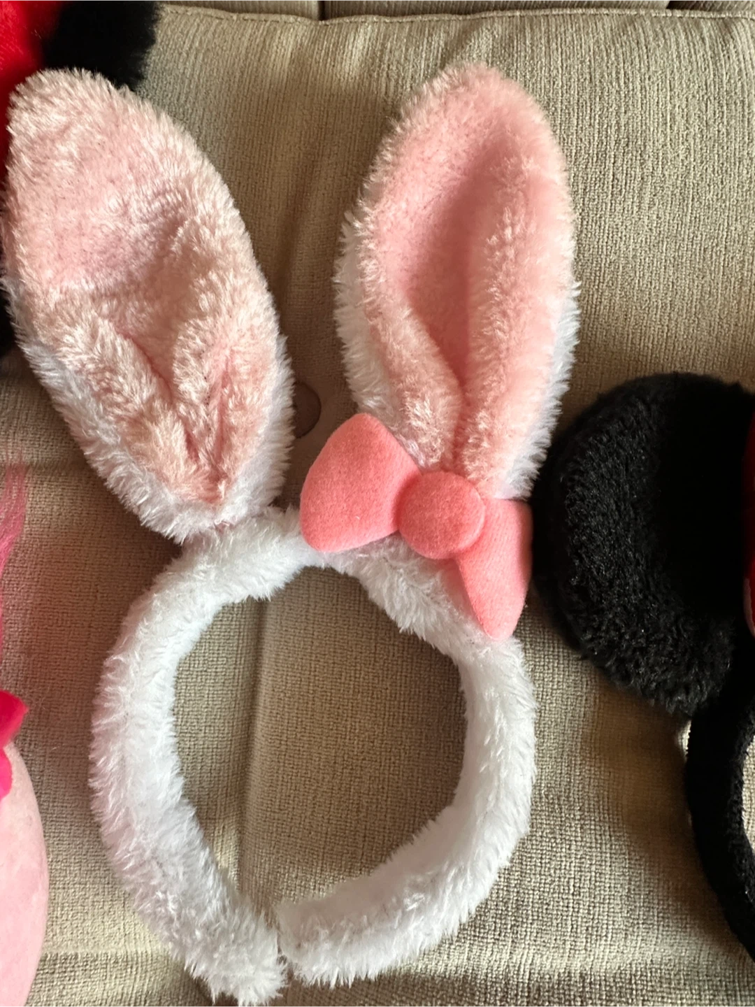 Selling a collection of fun headbands! There's a red and black bunny ear headband, a pink and white bunny ear headband, a Minnie Mouse ear headband, and a pink plush headband. They're all in great shape and ready for a new home