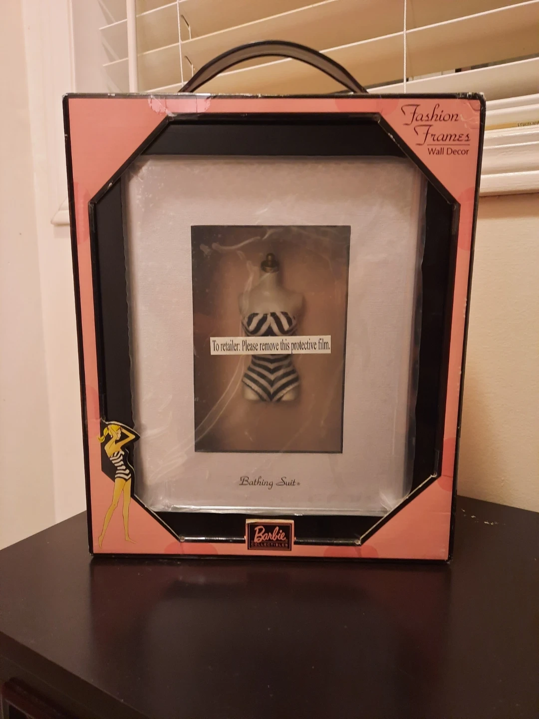 Selling a limited edition Barbie Fashion Frames wall decor featuring the iconic white &black stripe bathing suit. This collectible piece showcases Barbie's iconic style with a mannequin displayed in an elegant black frame and white mat. Never removed from box