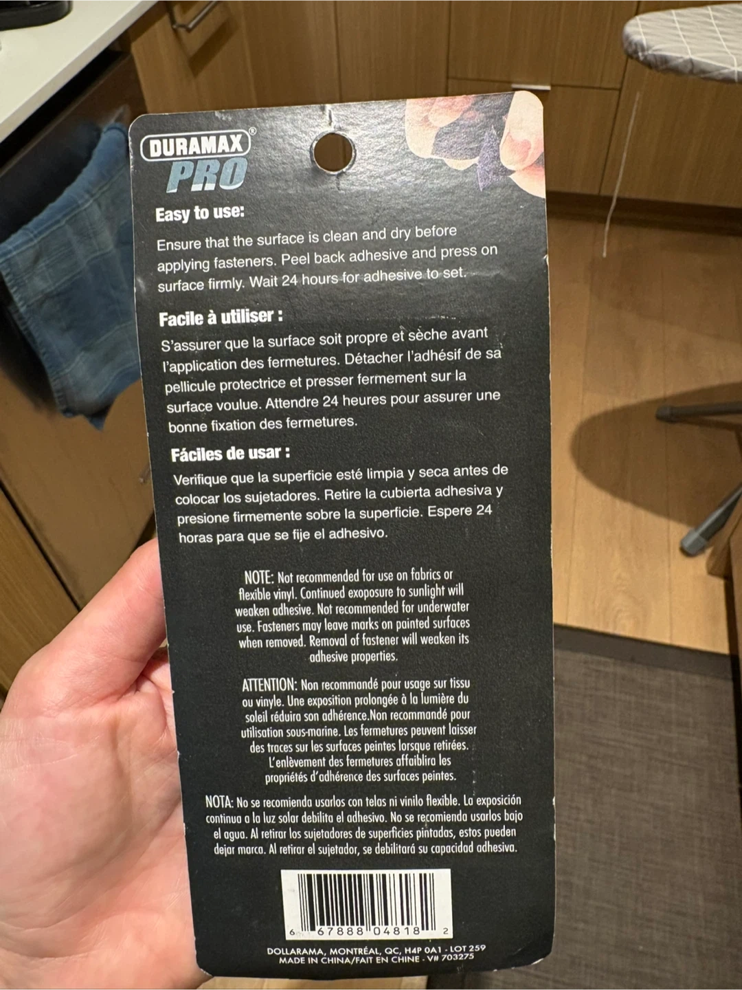 Brand new Duramax Pro self-adhesive fasteners! Easy to use: just ensure the surface is clean and dry before applying. Press and wait 24 hours for the adhesive to set. Perfect for various applications around the house
