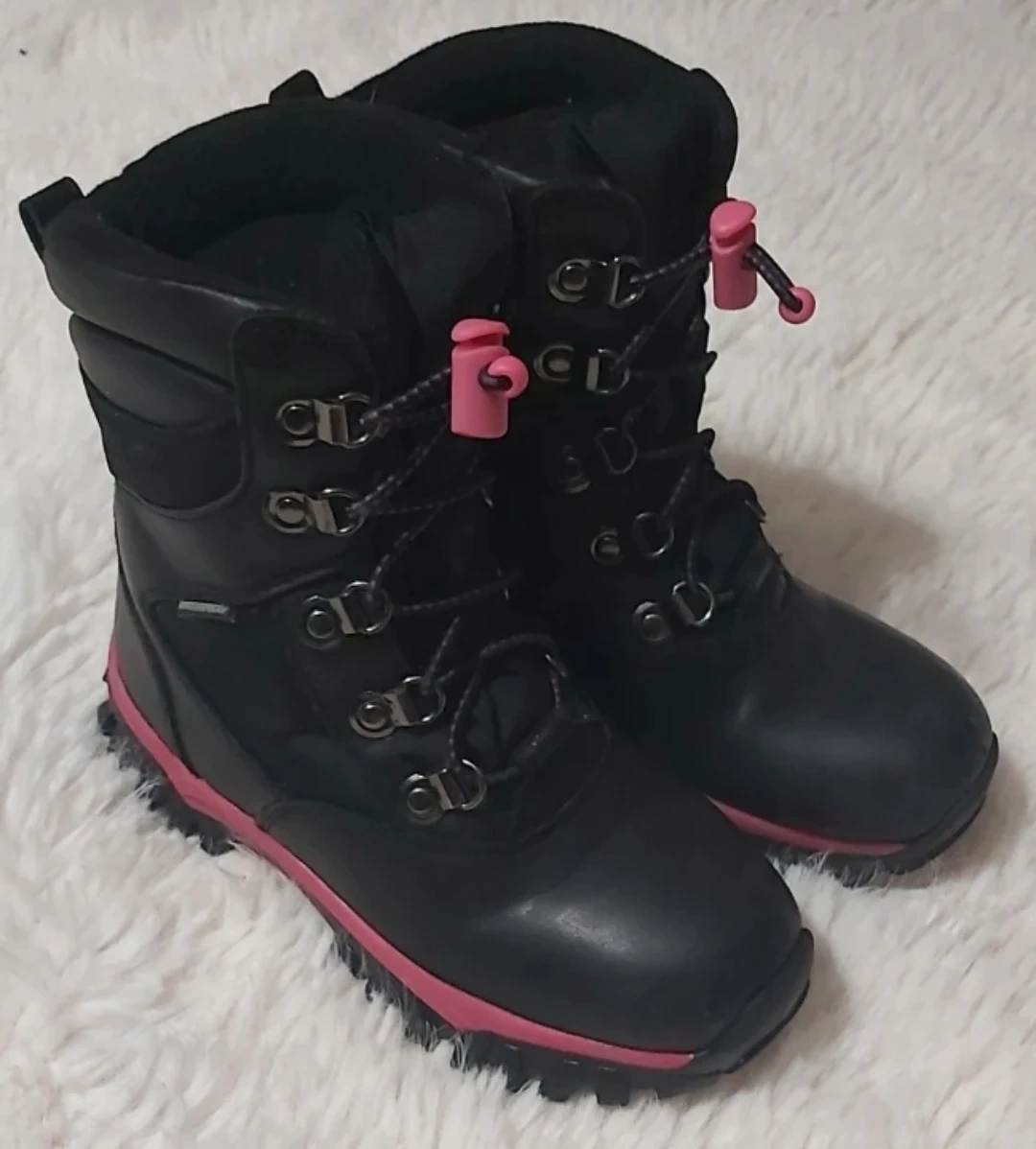 These Cougar winter boots are perfect for keeping your little one's feet warm and dry! They are black with pink accents and feature a lace-up closure with a toggle. The boots are waterproof and rated to -40°C/-40°F. They are a toddler size 1 (USA) / 32 (EUR)