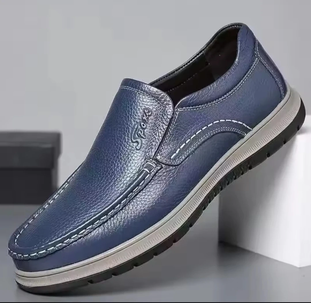 74Here's a stylish blue leather slip-on shoe. It looks great and is perfect for everyday wear!