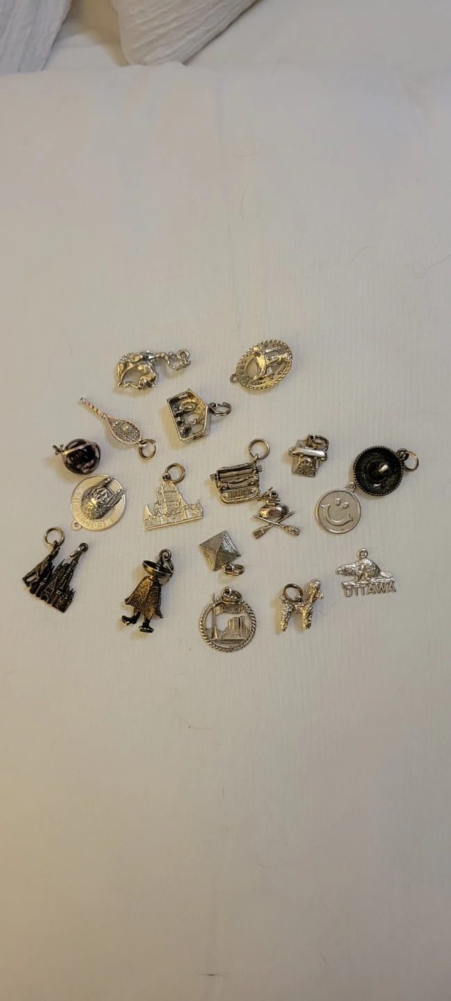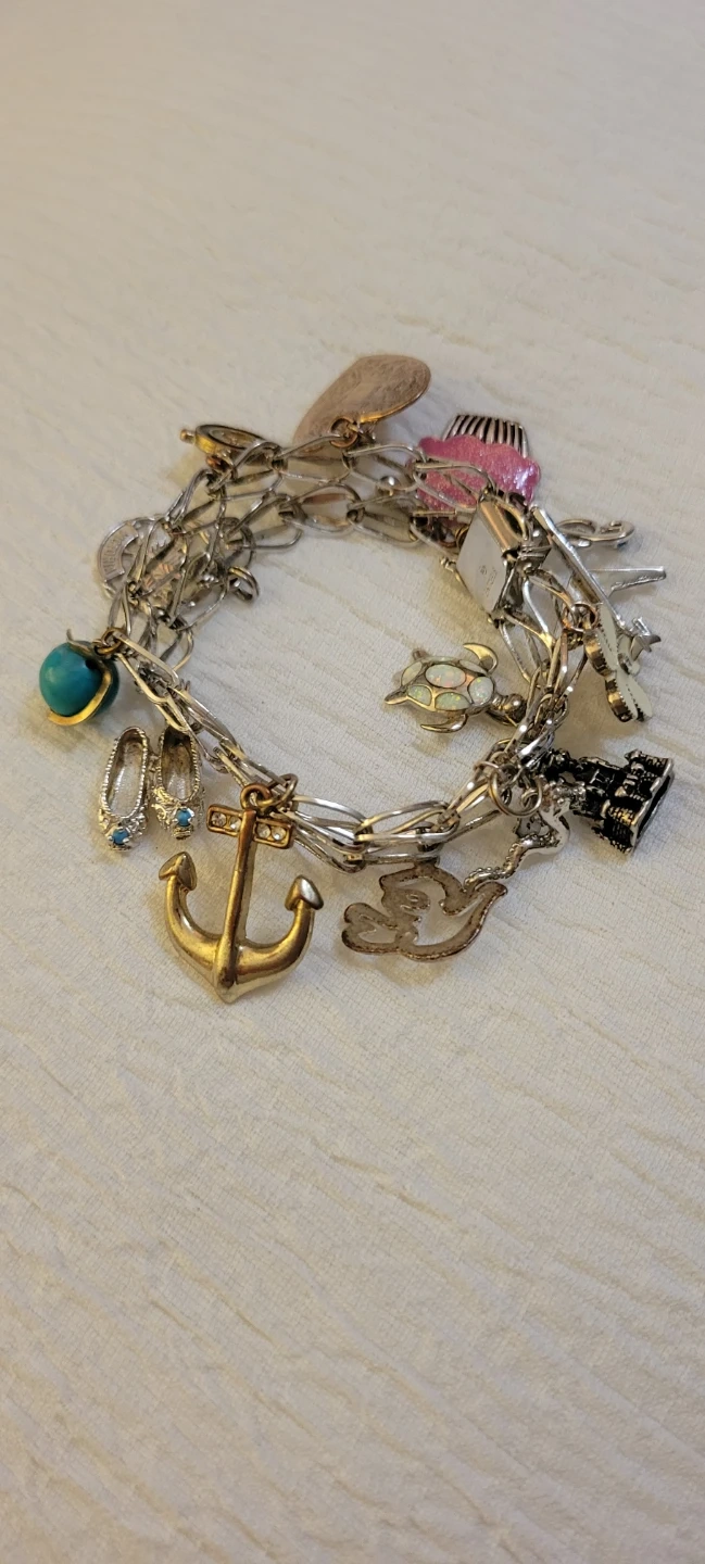 Selling a charm bracelet featuring a variety of charms! It includes charms like an anchor, a cupcake, a turtle, and more. Perfect for adding a personal touch to your style! Also included in this place is a satchel containing many other charms to add to the bracelet. Should you choose to