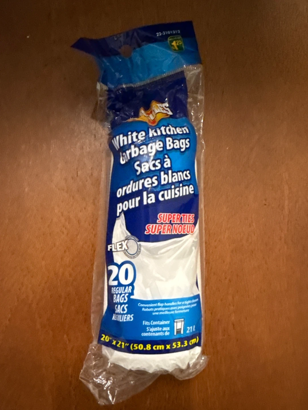 Free pack of White Kitchen Garbage Bags. This pack contains 20 regular bags with superties for a secure closure. Each bag measures 20" x 21" (50.8 cm x 53.3 cm) and fits a 21L container. They also feature convenient flap handles for a tight seal
