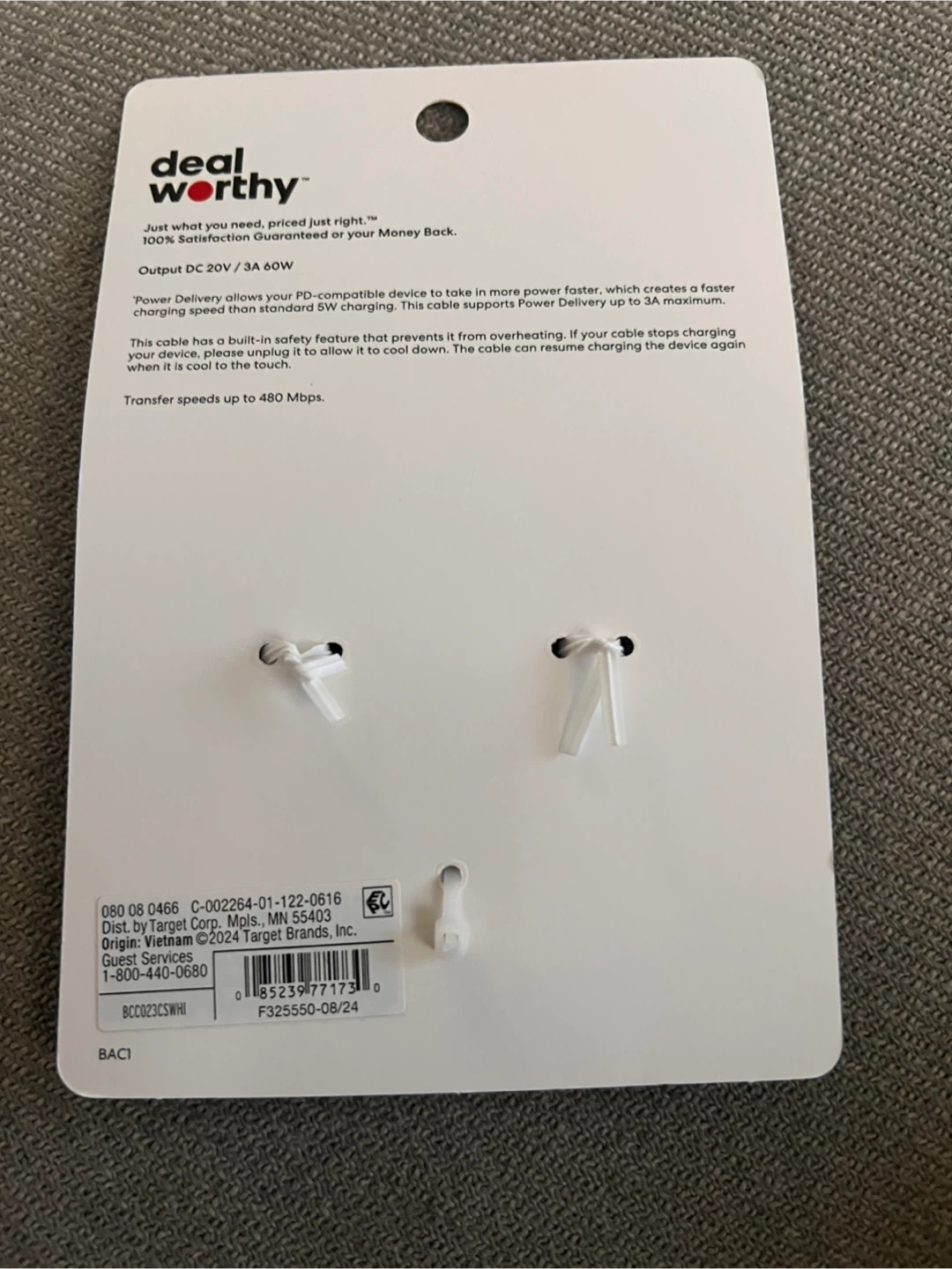 Selling a Dealworthy 3' USB-C to USB-C charging cable in white. It's compatible with USB-C enabled devices and supports Power Delivery for faster charging. The cable has a built-in safety feature to prevent overheating. It's brand new in the original packaging!