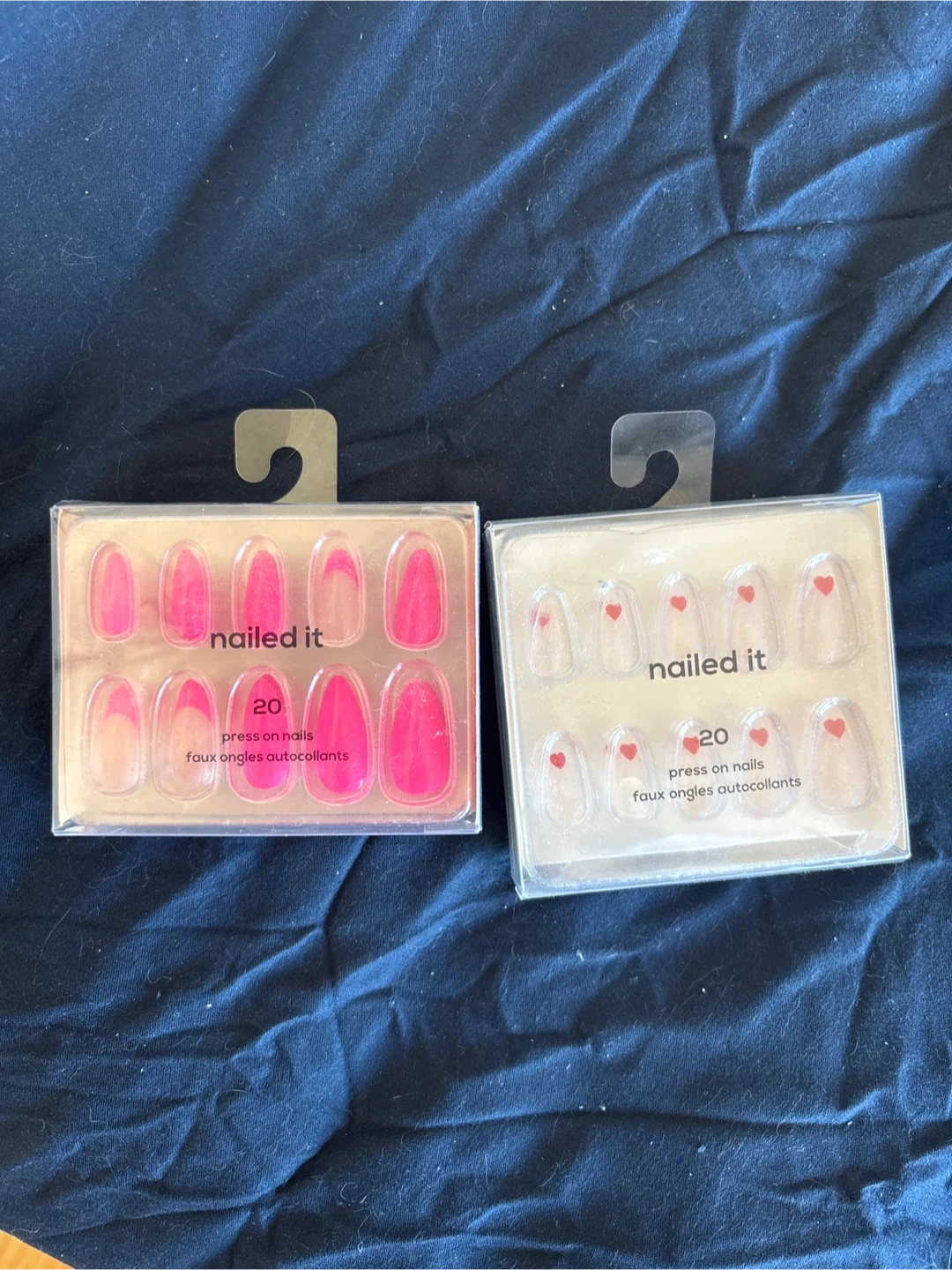 Two sets of Nailed It press-on nails! One set has a pink gradient design, and the other has a cute heart design. Each set comes with 20 nails. Originally bought for $8.90 each, these are a fun and easy way to switch up your look!