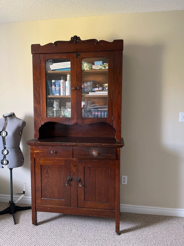 15This beautiful antique hutch offers ample storage with its glass-fronted upper cabinet and lower cupboard space, perfect for showcasing your prized possessions or storing everyday essentials. This is a used item. Made in 1923 and remained in my grandparents home in Oakville till recent years. * Solid wood construction * Glass-fronted upper cabinet * Two drawers * Lower cupboard with doors This hutch is a fantastic find for anyone looking to add a touch of vintage charm to your home. It's seen a few stories in its time, which adds to its unique character. If the ad is up, it's still available – ready to find its next loving home! Contents not included.