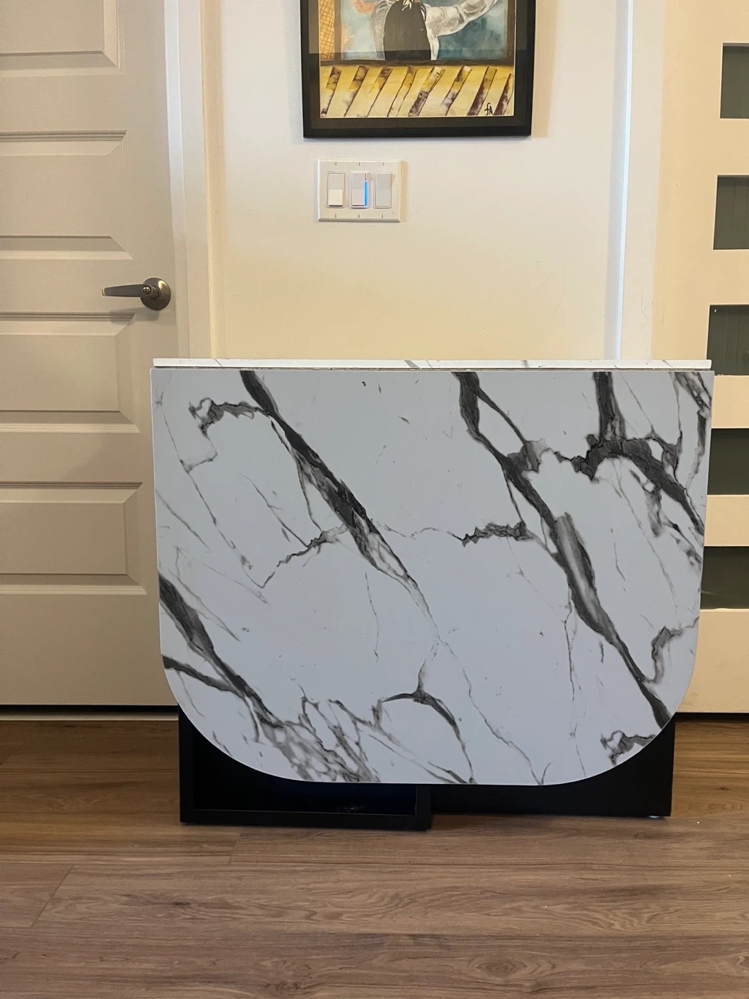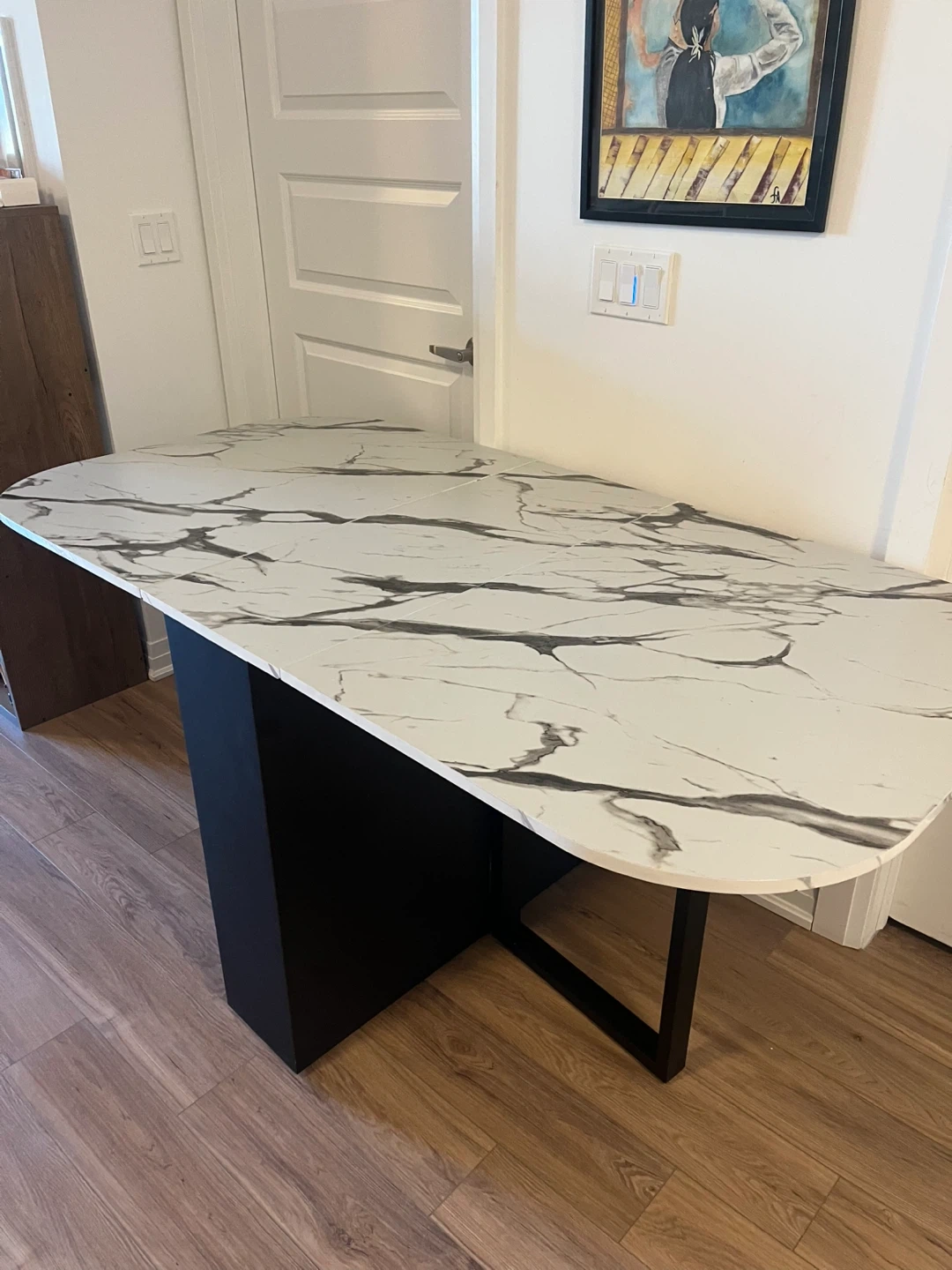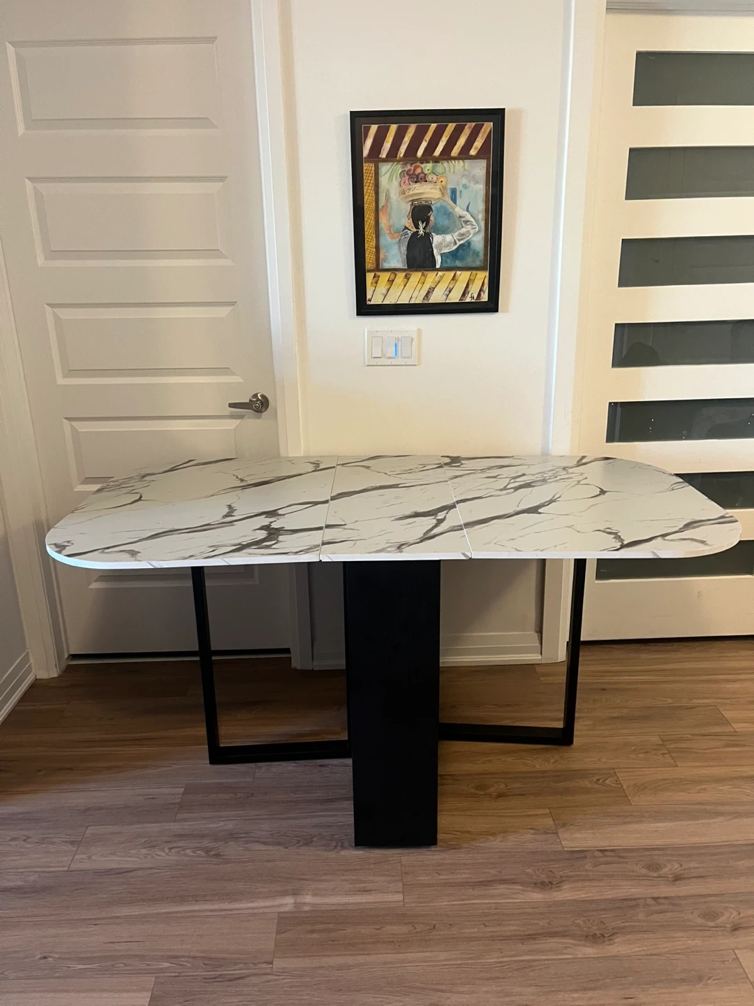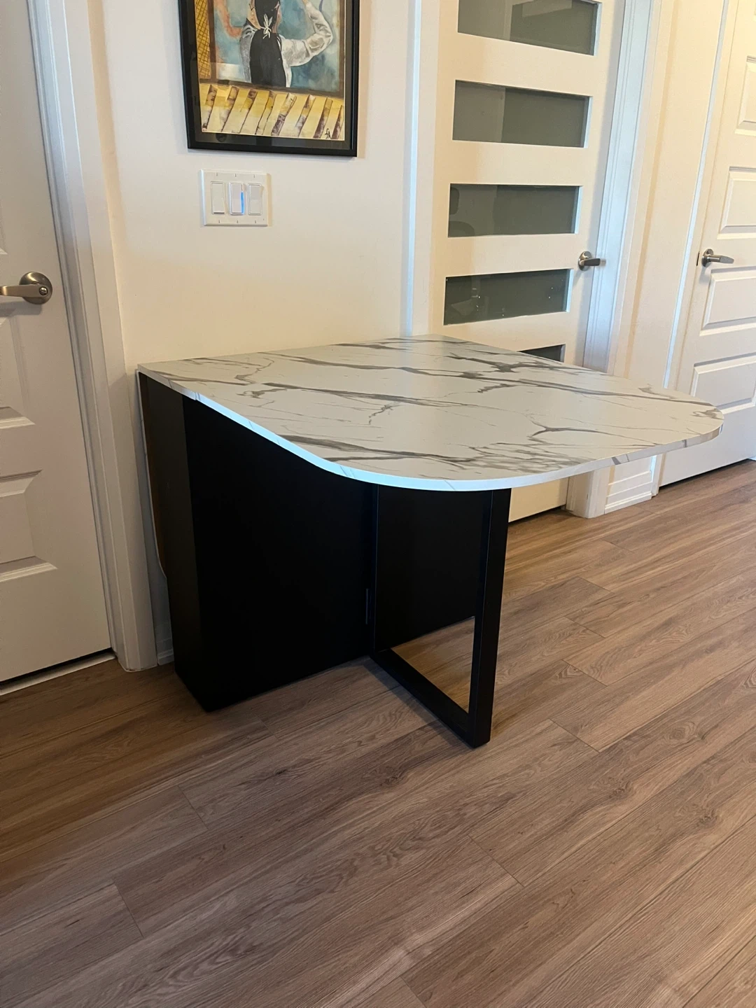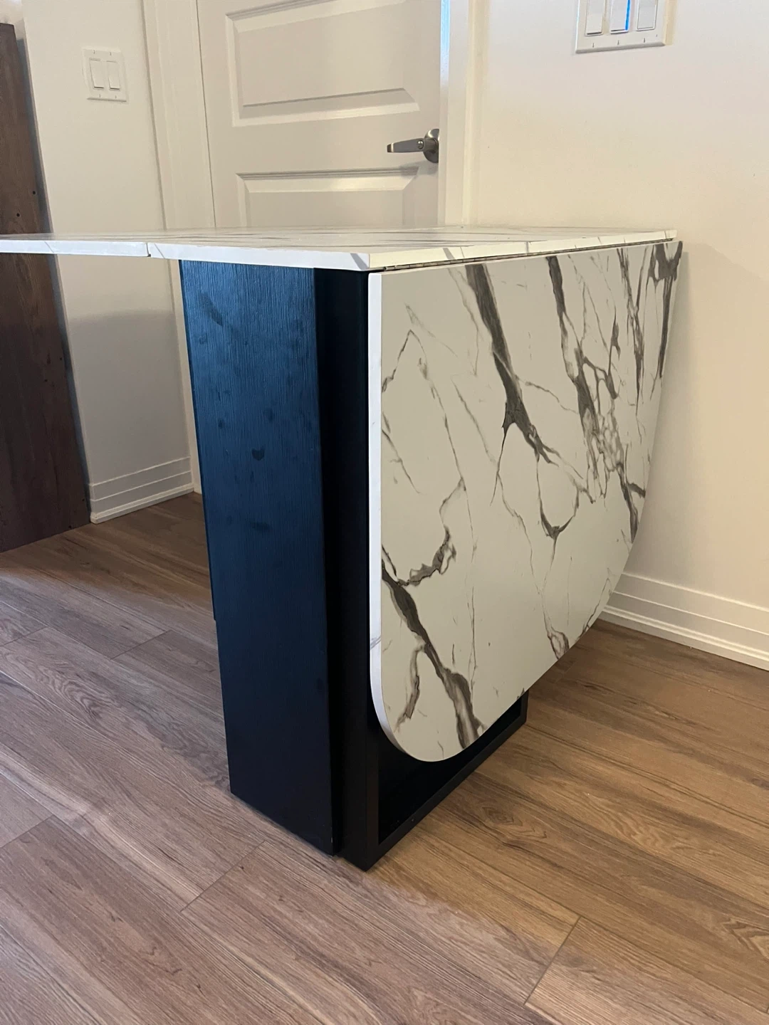 Selling a foldable drop leaf dining table! It's in great shape and perfect for smaller spaces or for when you need extra table space. The top has a nice white marble pattern and the base is black. It's a really handy piece of furniture!