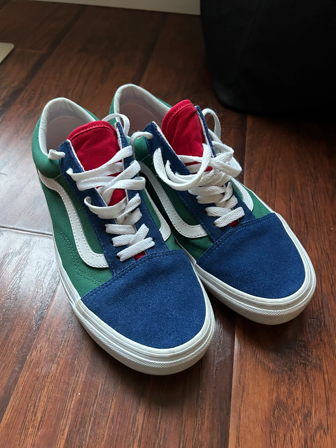 Selling a pair of Vans Old Skool Patchwork sneakers! They are in great condition and feature a cool patchwork design with blue, green, yellow, and red accents. The size is US Men's 8.5 / US Women's 10. Only worn once.