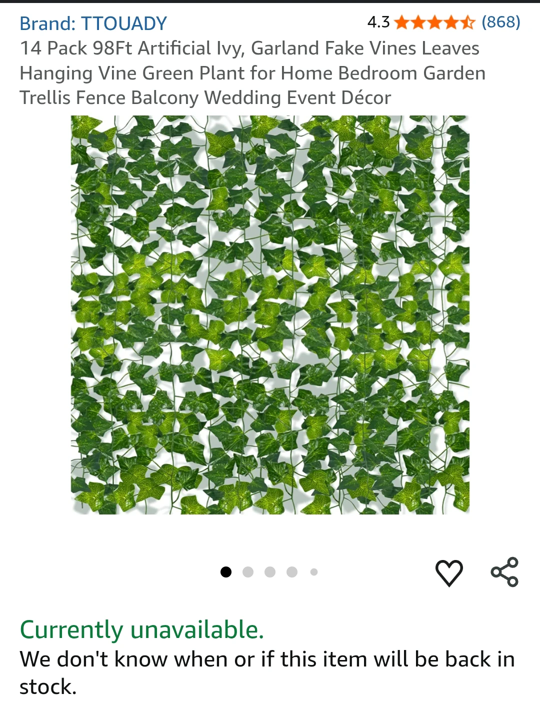 Selling a 8-9 pcs of TTQUADY artificial ivy! Initially it has 14, but I only used a few, there might be 8-9 pcs left. These are 98ft artificial vine leaves, perfect for adding a touch of green to your home, bedroom, garden, or even for wedding decor. They're great for hanging or using on a trellis fence or balcony