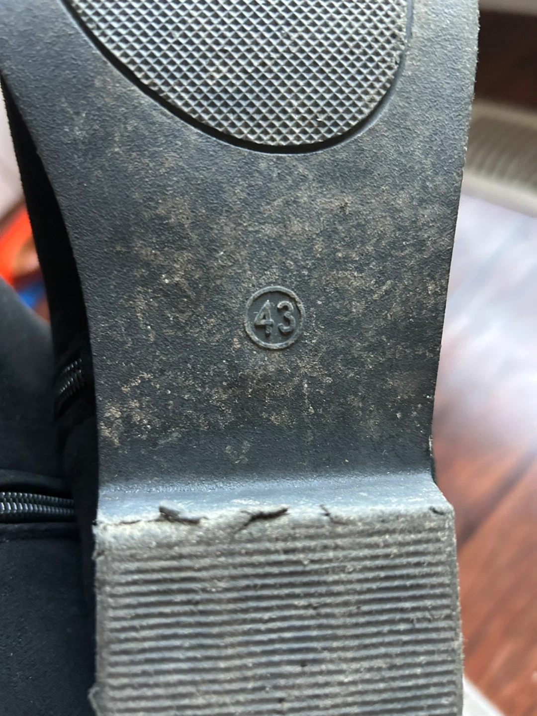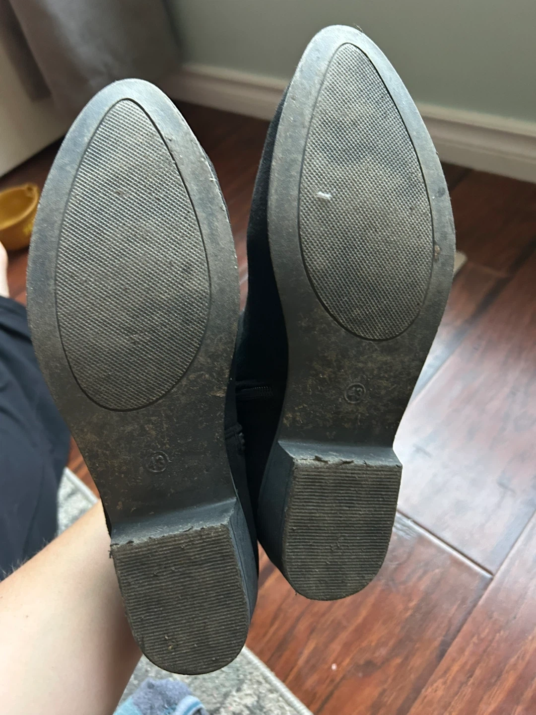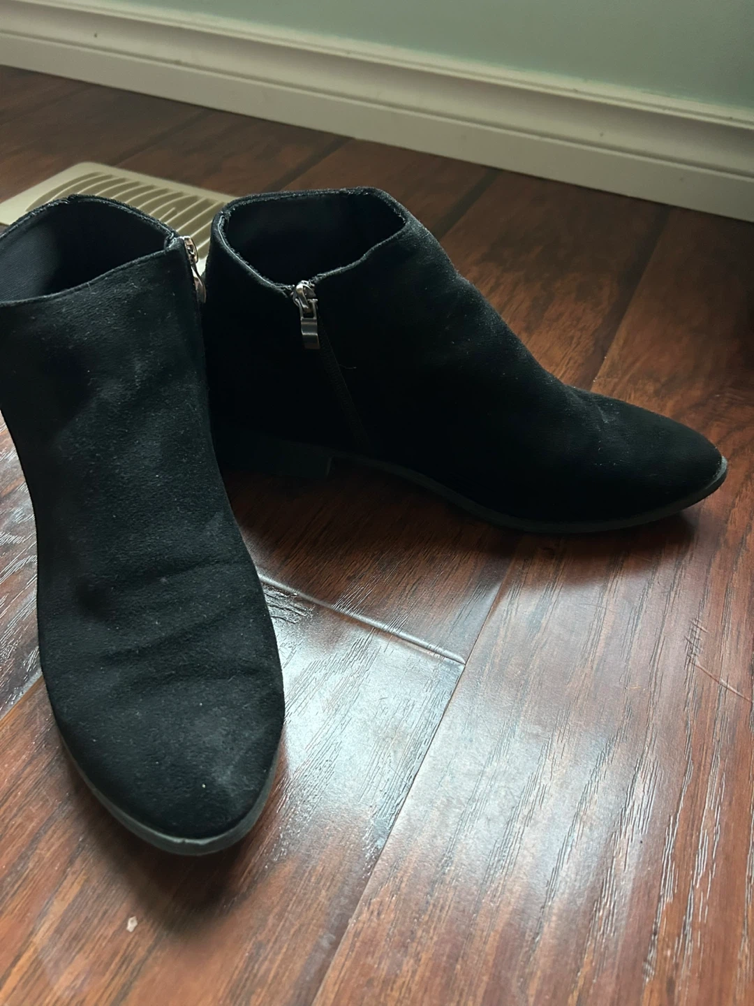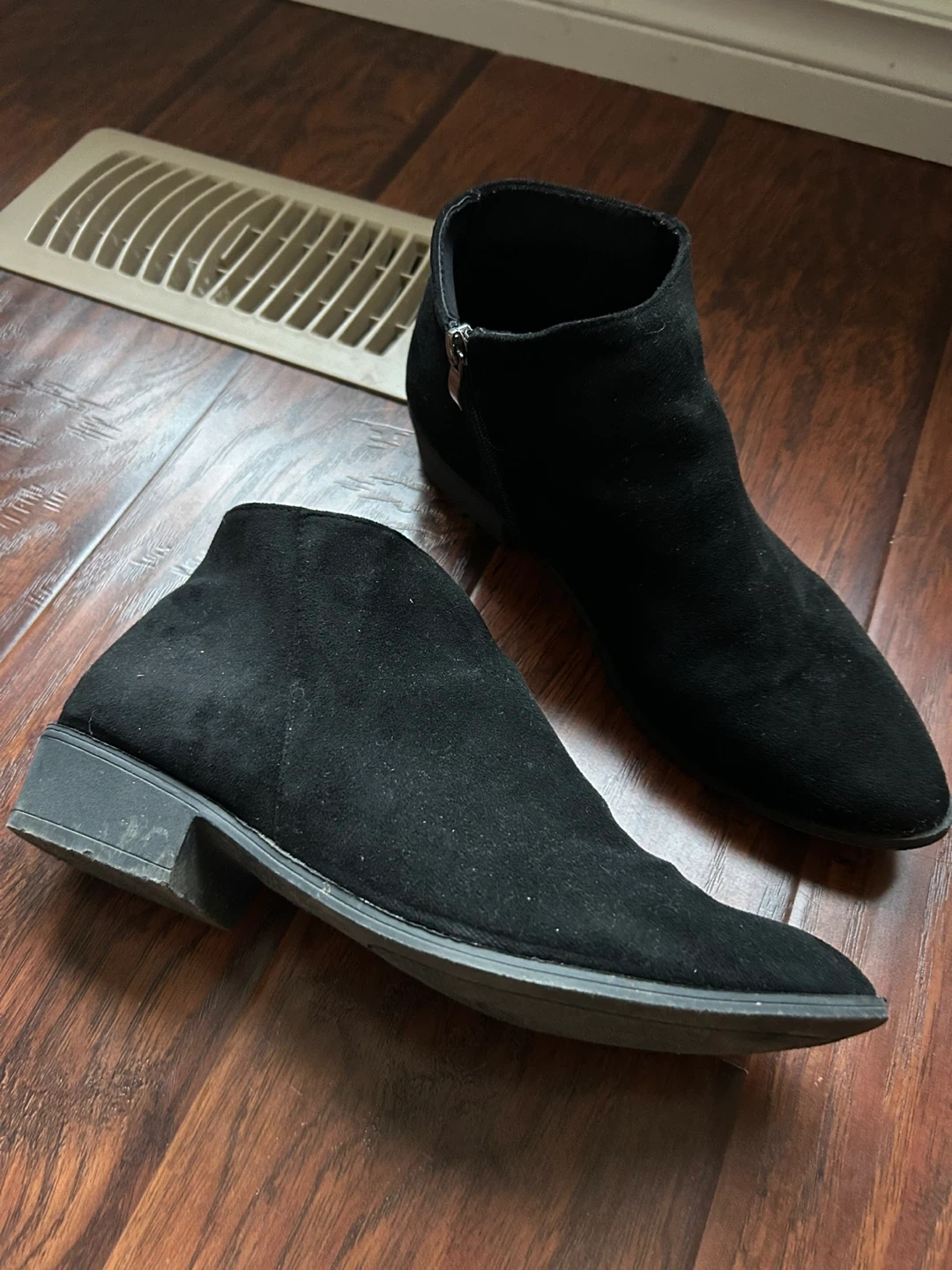 Selling a pair of black suede ankle boots. They're in good condition, with a side zipper for easy wear. The soles show some signs of use, but the suede is still in great shape. Size 11