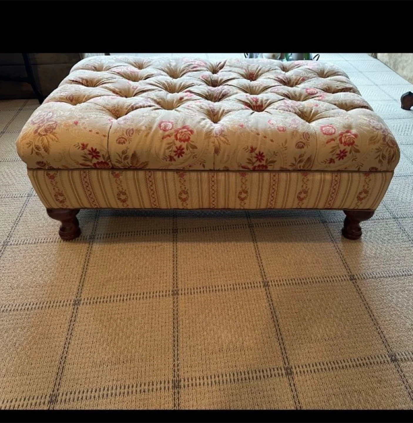 Selling a lovely floral tufted ottoman! It's in great condition and would add a touch of elegance to any room. The floral pattern is really pretty, and the tufted design gives it a classic look
