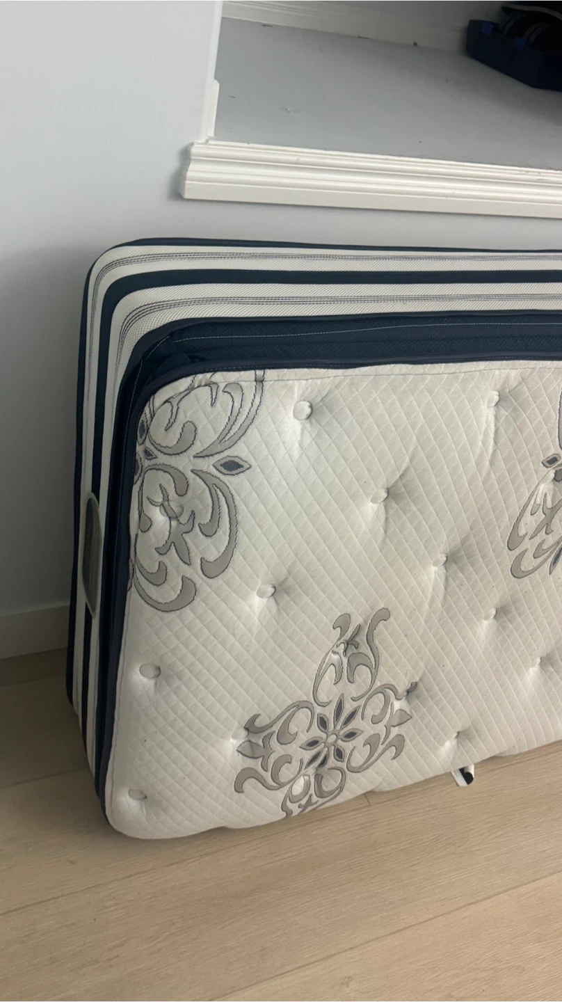 Selling a mattress in great condition. It features a white quilted top with a floral pattern and navy blue striped sides. Ready for a new home! Size -twin size ,bought for 600.