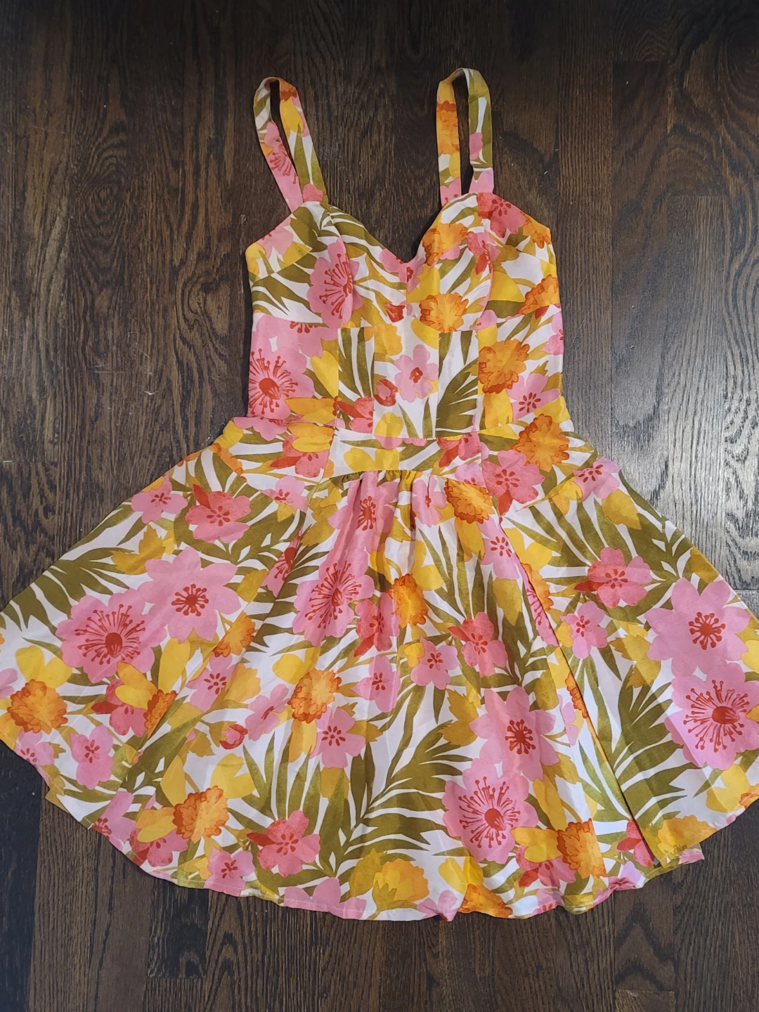 Selling a cute floral dress from The Man Repeller x PJK! It's a size XS and features a vibrant floral pattern with pink, yellow, and green hues. Perfect for spring or summer!