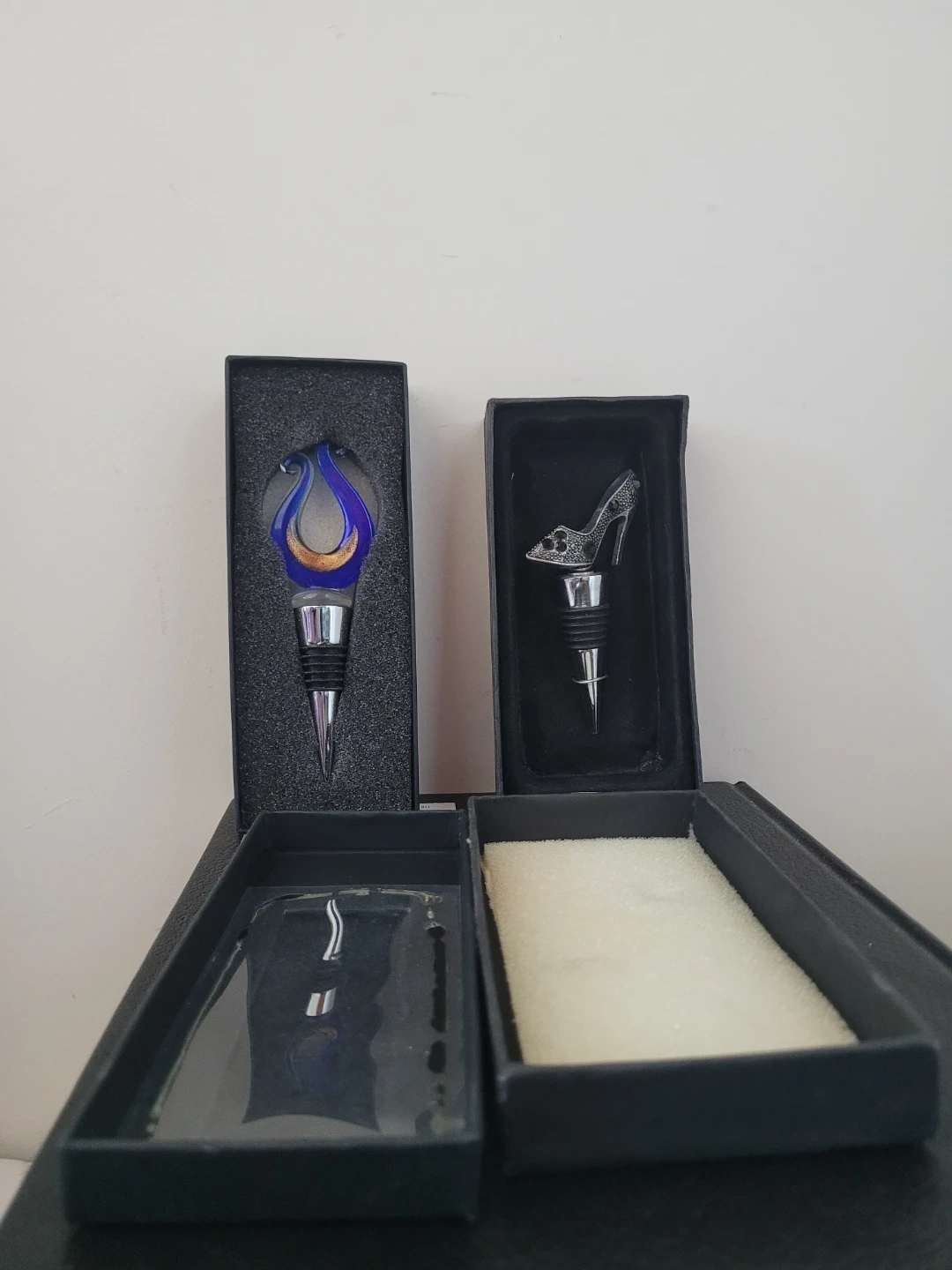 879Two decorative wine stoppers, each with its original box. One features a blue and gold teardrop design, and the other is shaped like a sparkly high-heeled shoe. Perfect for adding a touch of elegance to your wine bottles! $5 each, bundle 4 items for $15