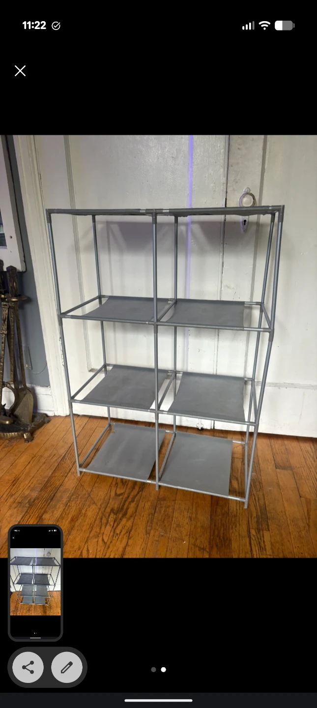 Here's a sturdy shelf unit with a grey metal frame! It's perfect for adding some extra storage to any room in your home or office. It's in great condition and ready for a new home