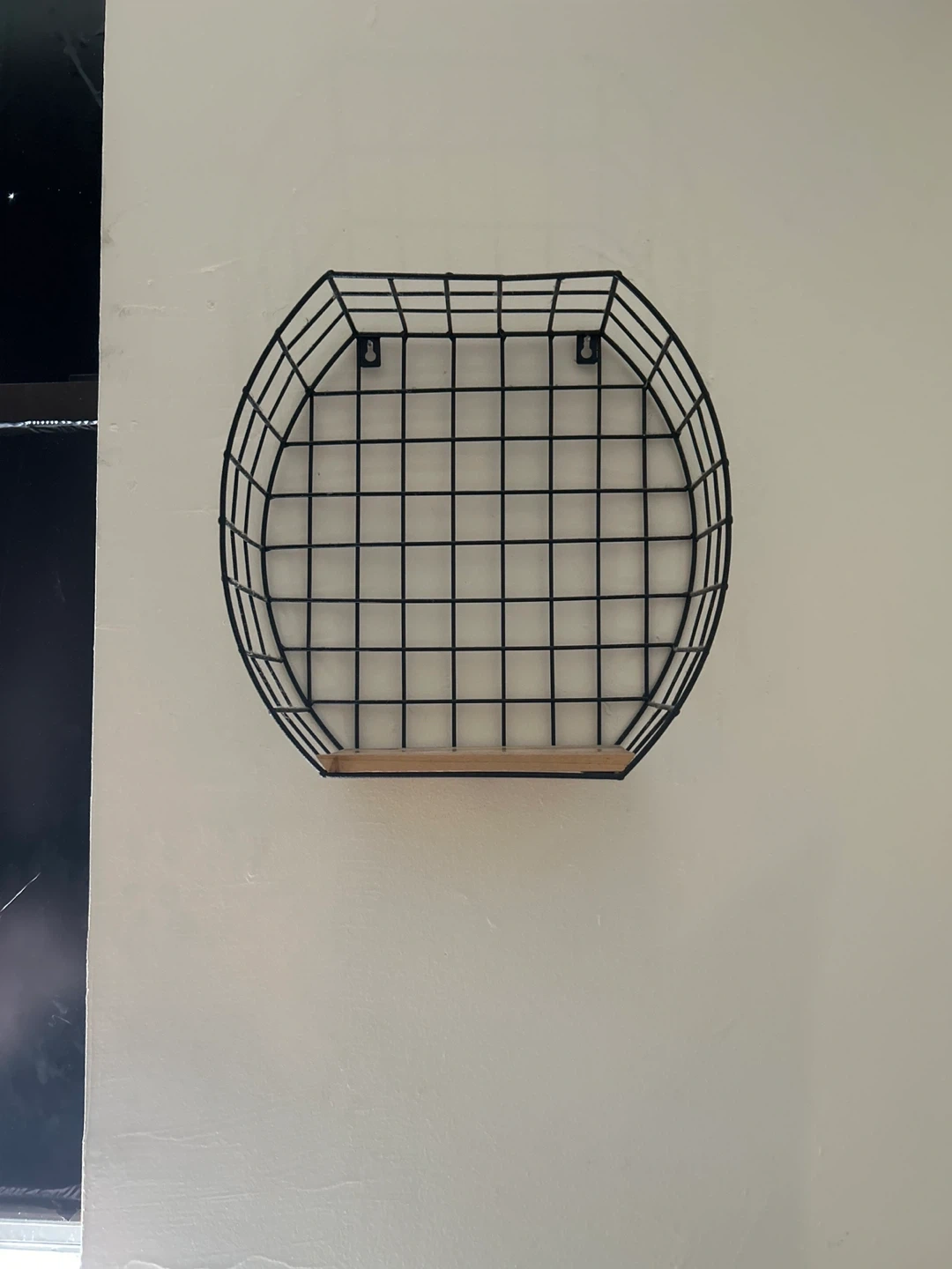 Selling a black wire wall basket that comes with a wooden shelf. It's in great condition and ready to add some storage and style to your space! Perfect for organizing small items or displaying decor