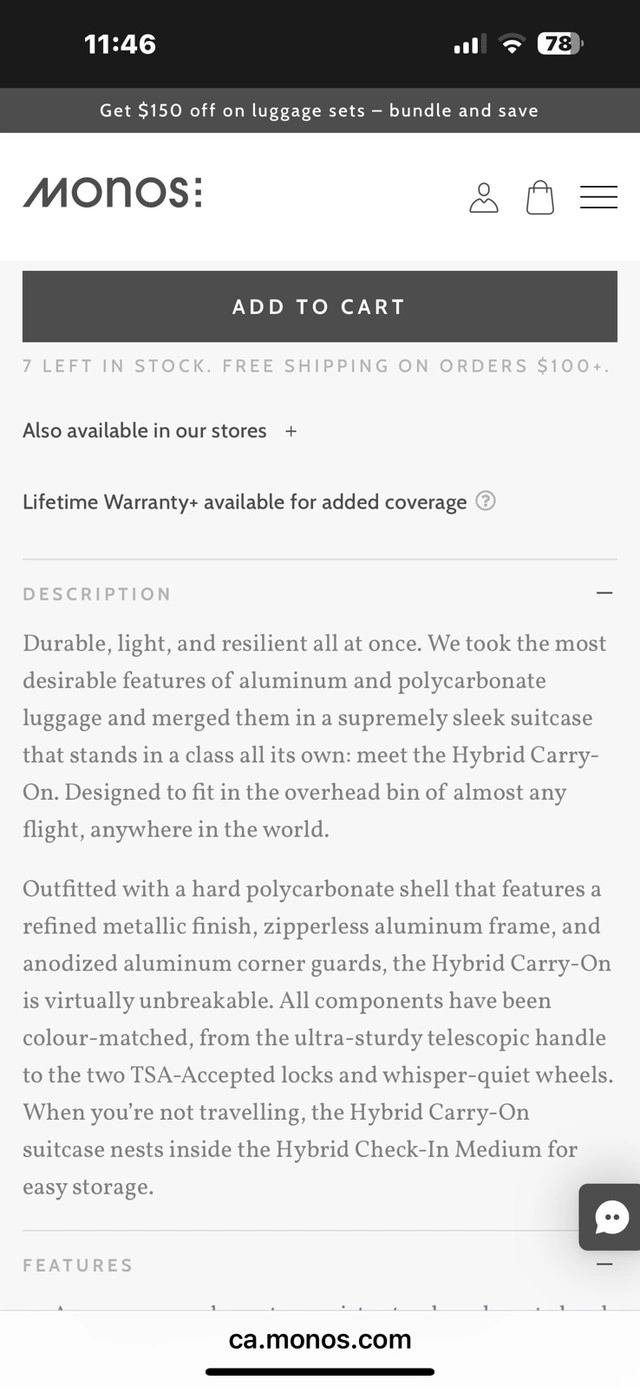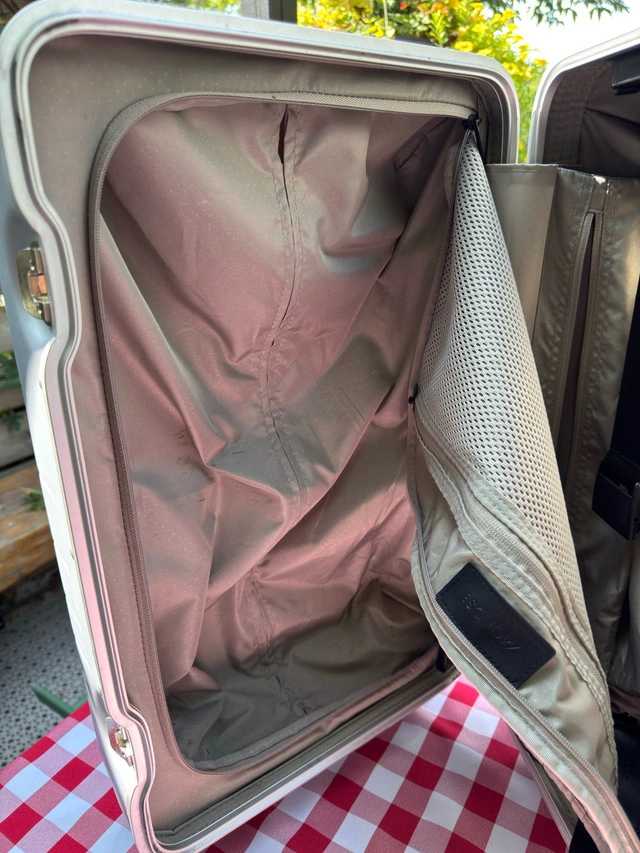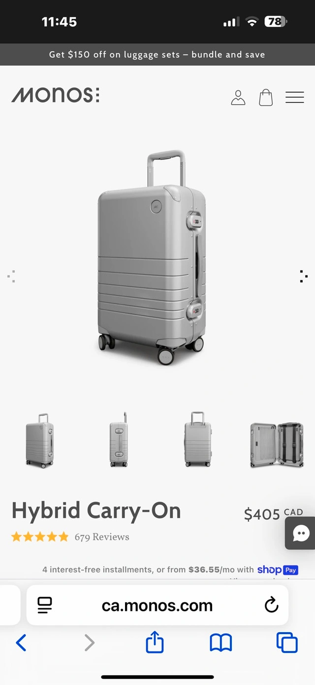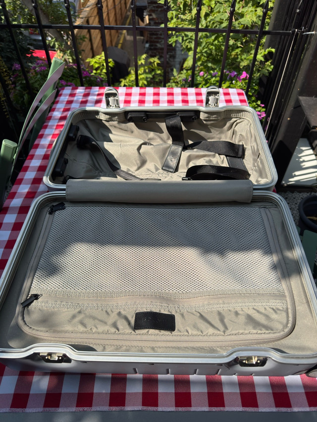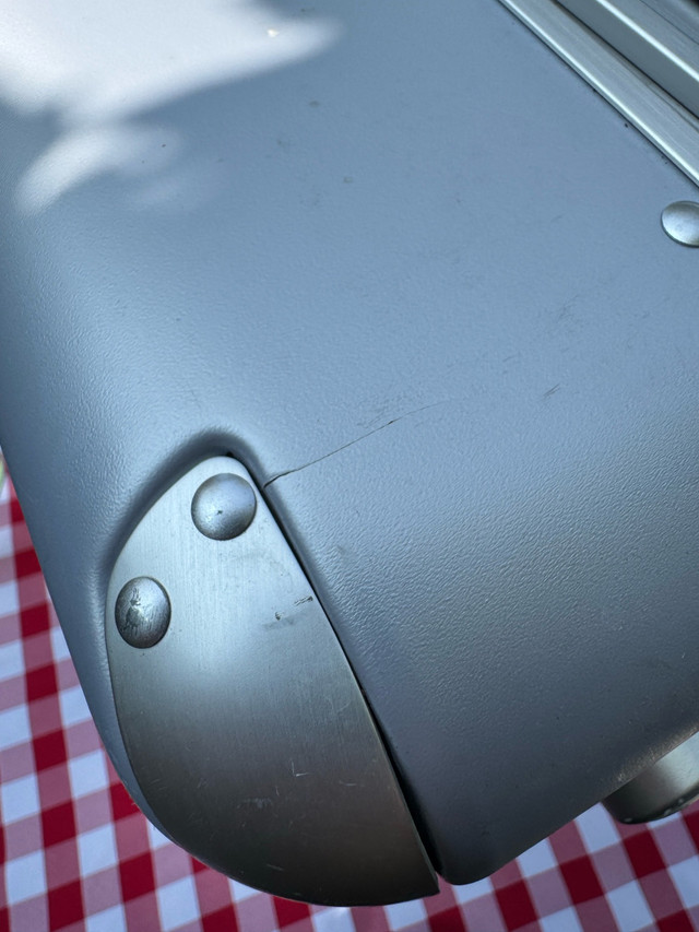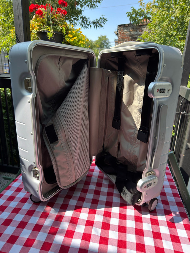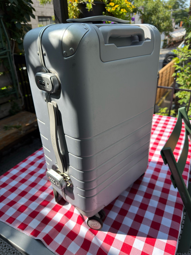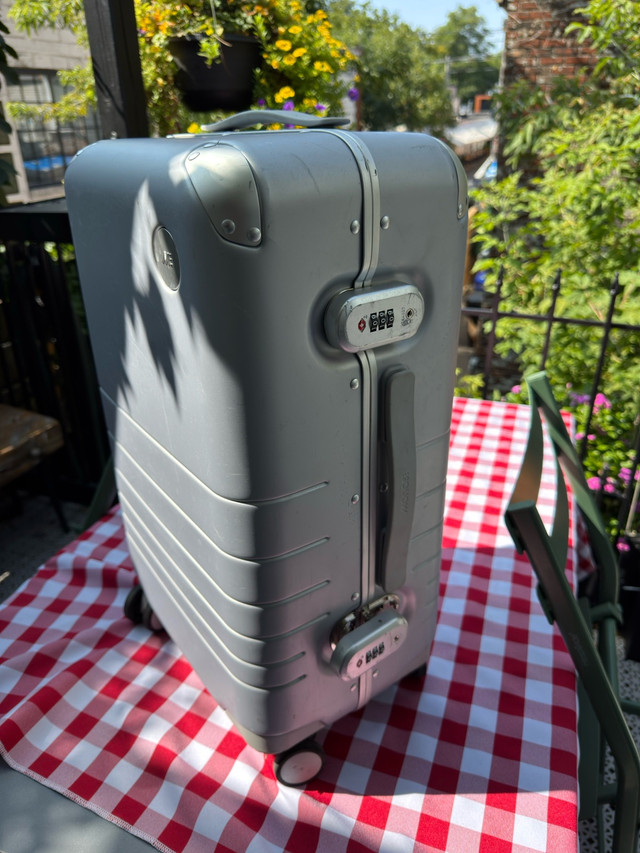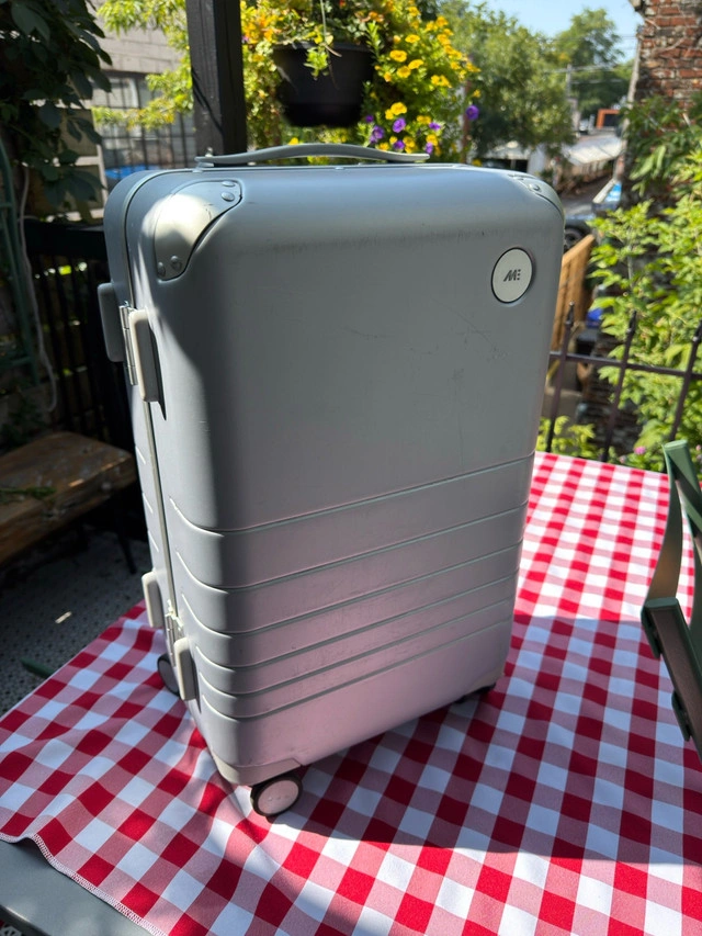 This is a Monos Hybrid Carry-On suitcase, perfect for your travel needs. From a clean home. It's in good condition. It is slightly scratched and has a tiny crack in the shell but is not a problem. I have 3 carry ons and just no longer need it. Here are some of its features: * Hard polycarbonate shell with a refined metallic finish * Zipperless aluminum frame * Anodized aluminum corner guards * TSA-Accepted locks * Whisper-quiet wheels This suitcase is durable, light, and resilient, making it an ideal travel companion.