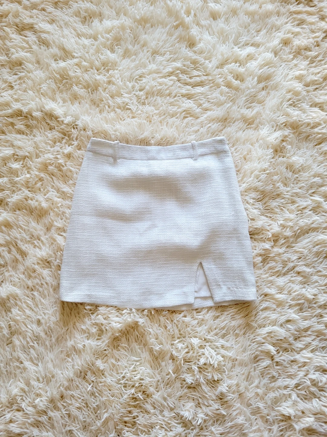 Selling a cute white mini skirt! It's in great condition and has a subtle slit on the side. Perfect for a night out or a casual day.