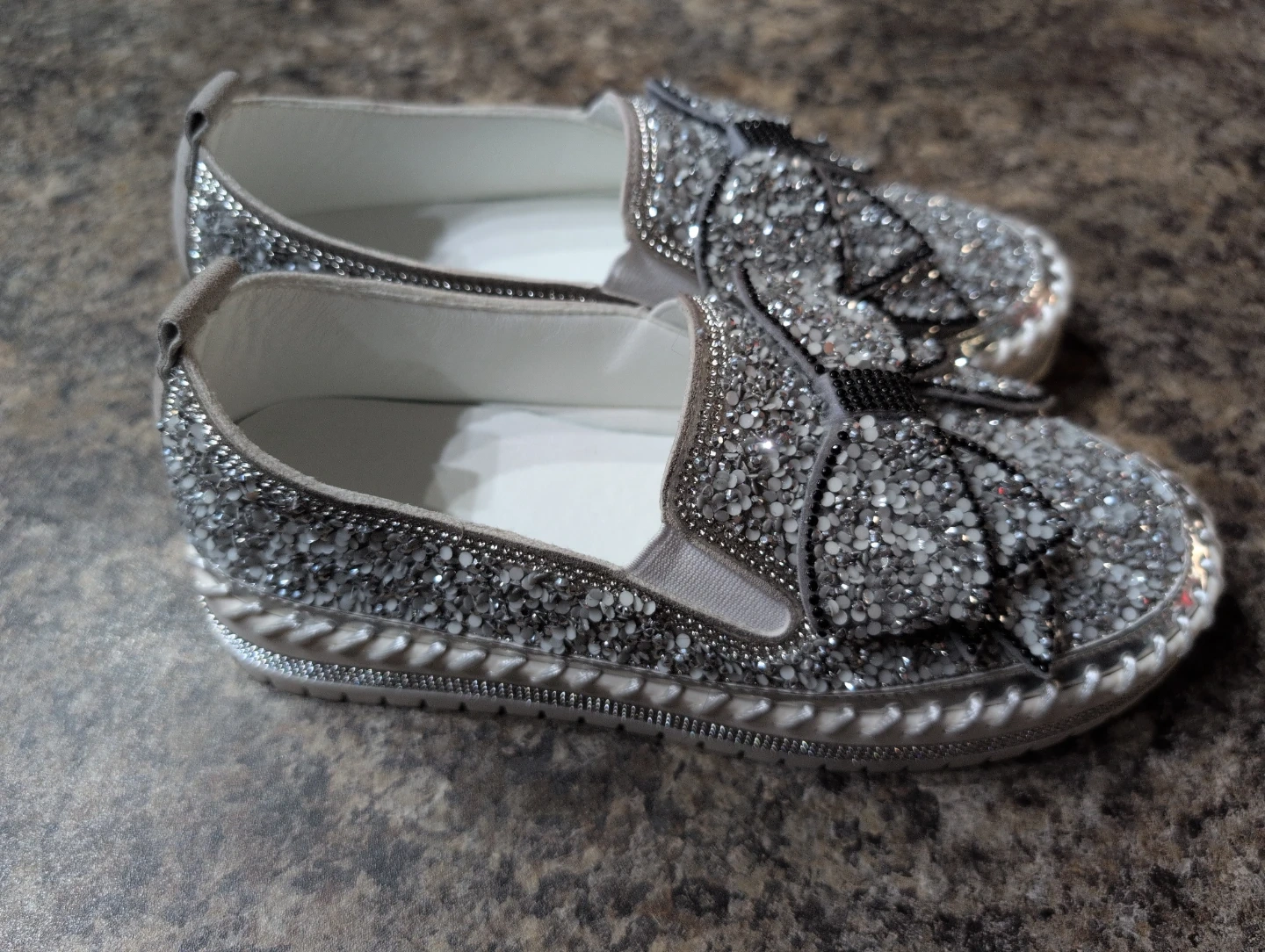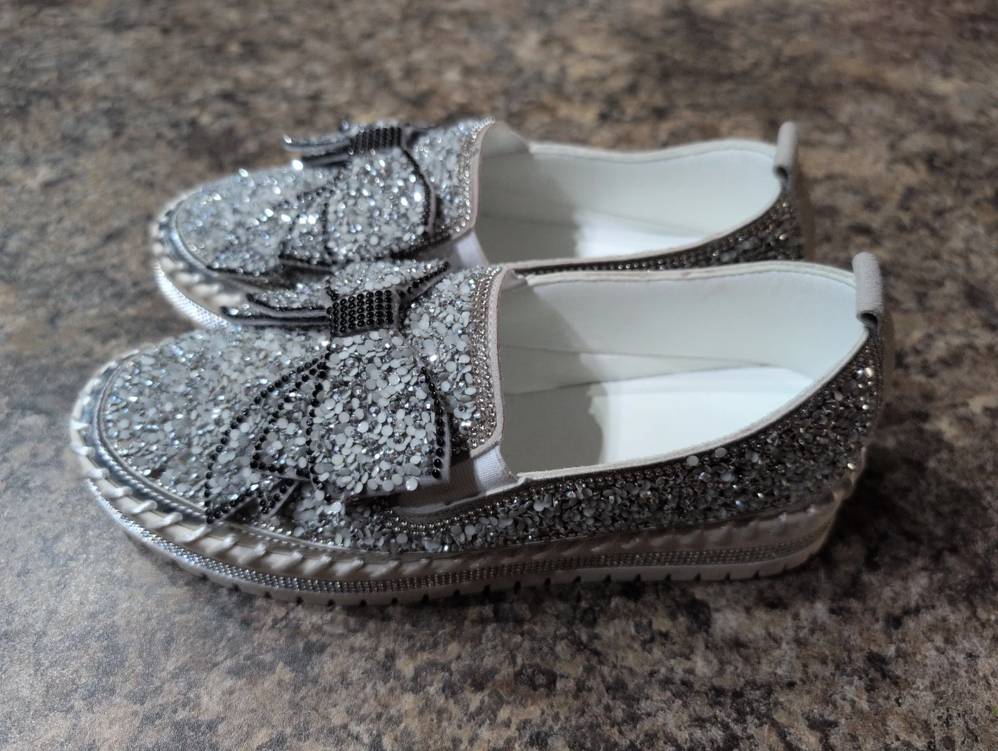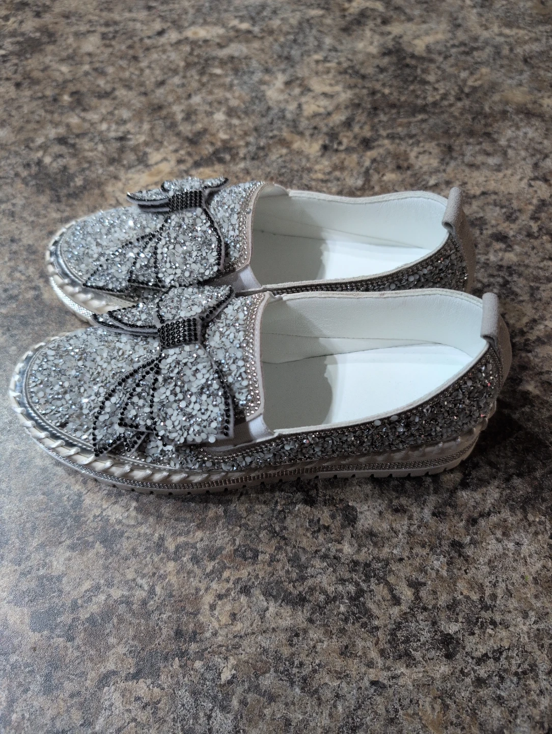 These size 6 slip-on shoes are covered in silver glitter and feature a decorative bow on the front. They're perfect for adding a bit of sparkle to any outfit!