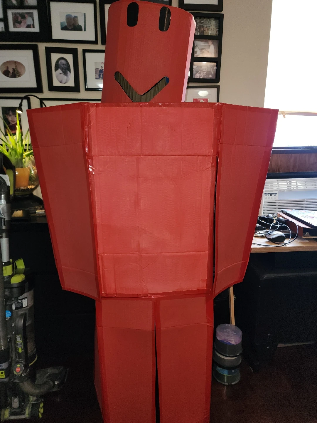 1000+Offering a homemade red cardboard Roblox costume! Fits kids 5' tall It's perfect for kids dress up. It's in great condition and ready for a new owner. Will be recycling it within 24hrs if no one wants it.