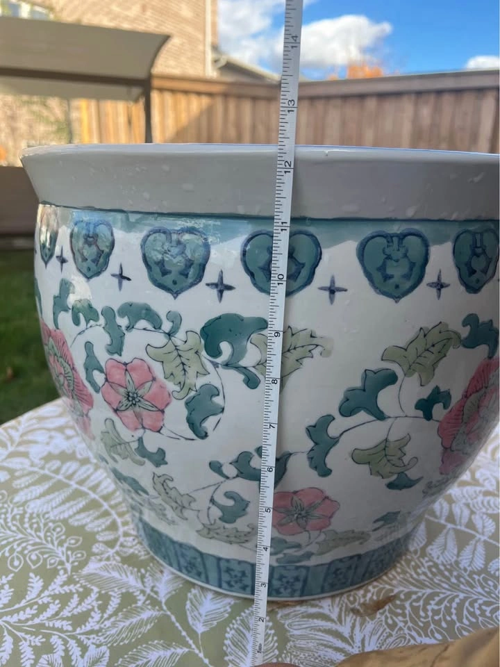 Large porcelain planter with pastel floral design. Beautifully shaped with soft colors. Perfect as a flower pot, fish bowl, or decorative home piece. In great condition with no chips or cracks.