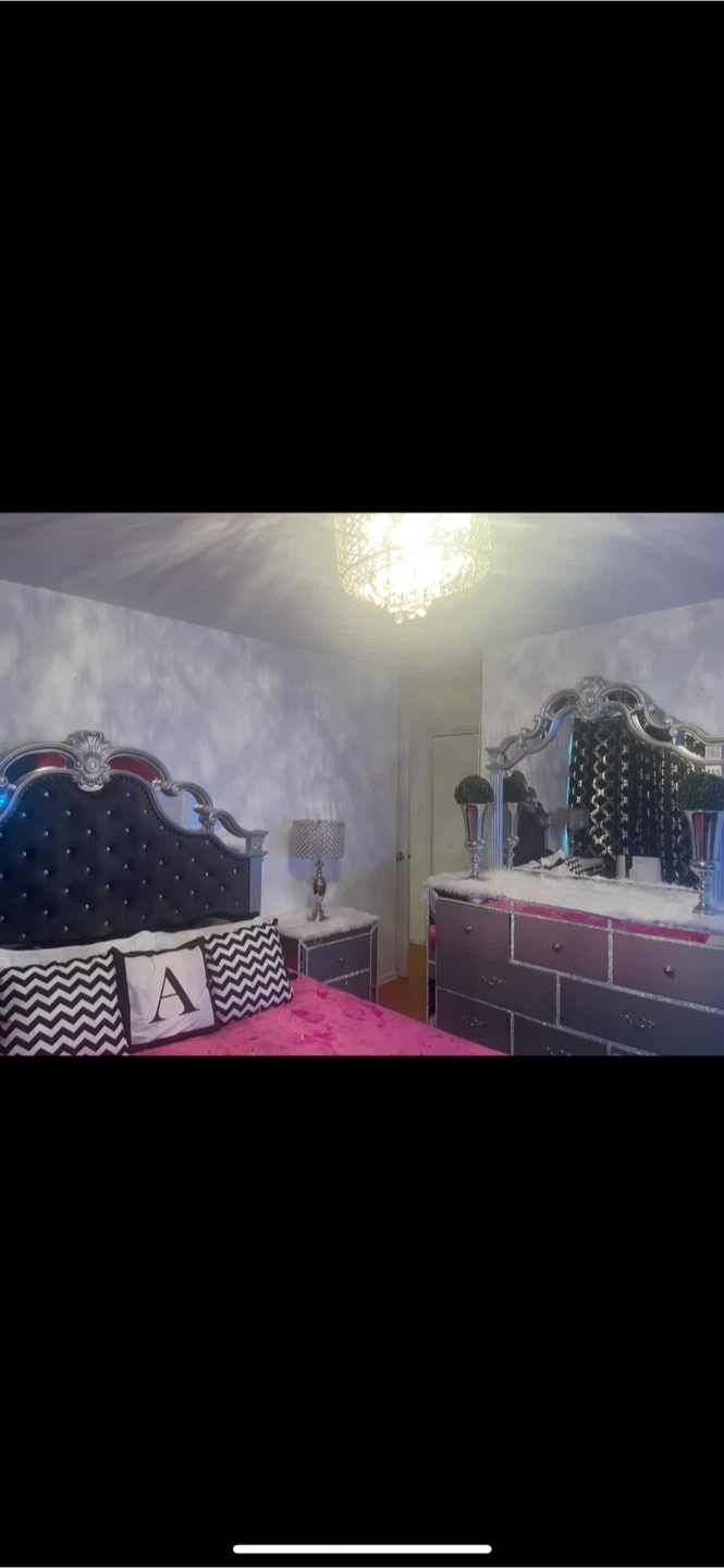 Selling a bedroom set, including mattress and mattress pad and mattress cover , a bed frame, 2 nightstand, and dresser with mirror. The set features a black and silver colour scheme. Pick up only , there is a slight damage and it does not affect the bed at all can easily be fixed will show you if you are interested