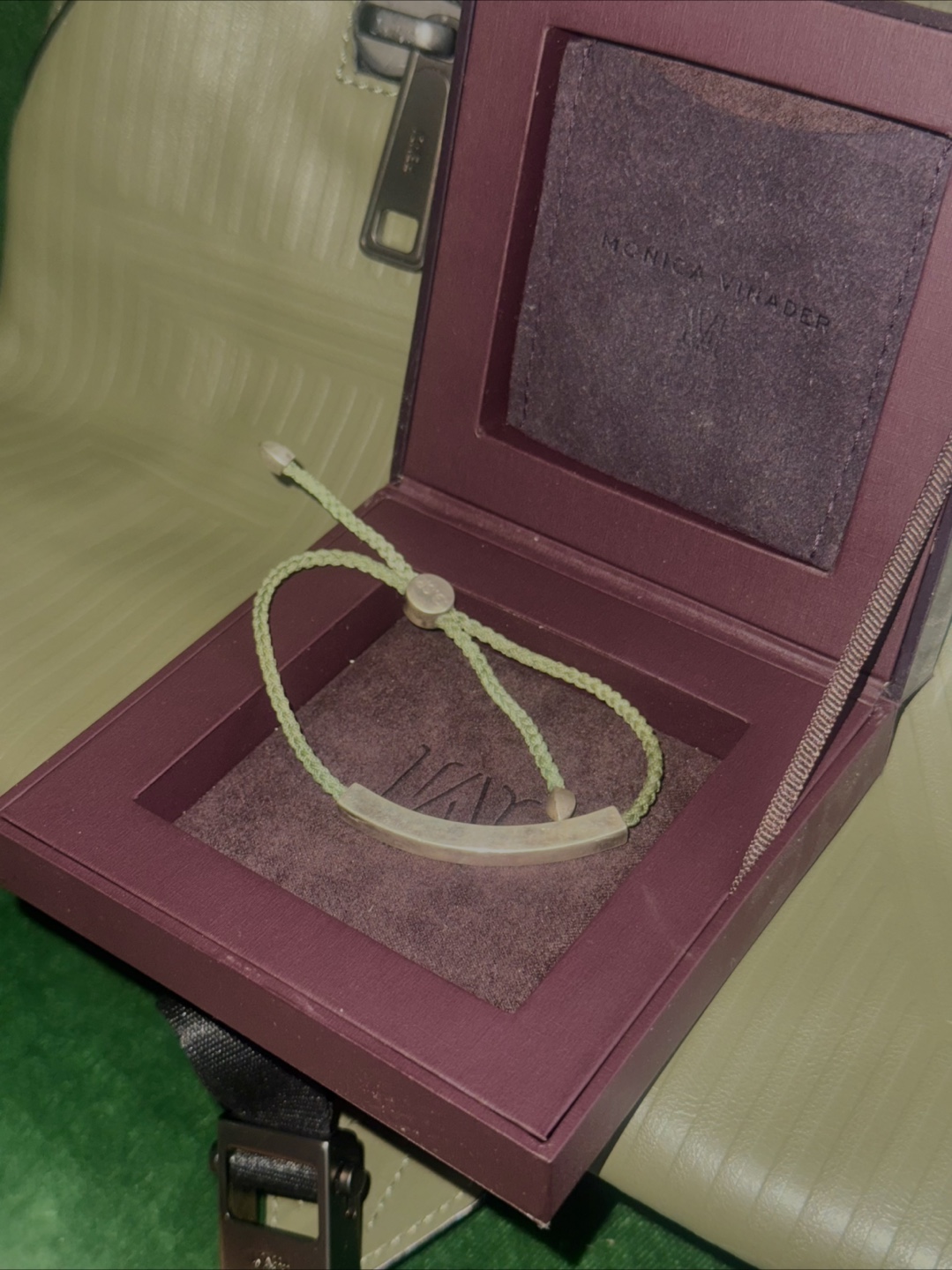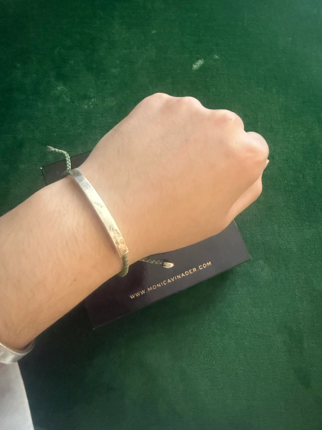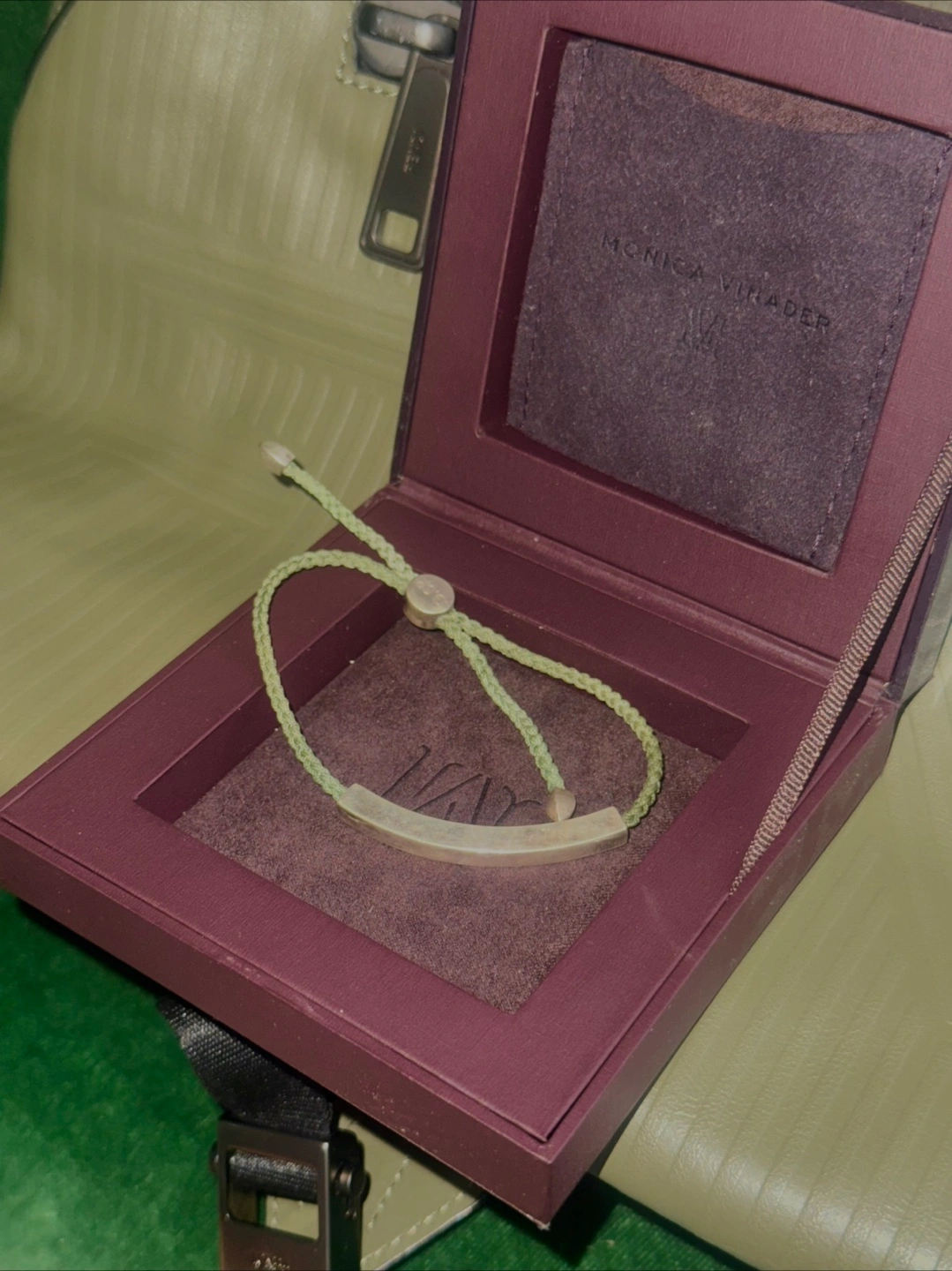 Selling a Monica Vinader linear friendship bracelet sterling silver with a green cord. It comes with its original box and pouch. Pick up from queens Elmhust
