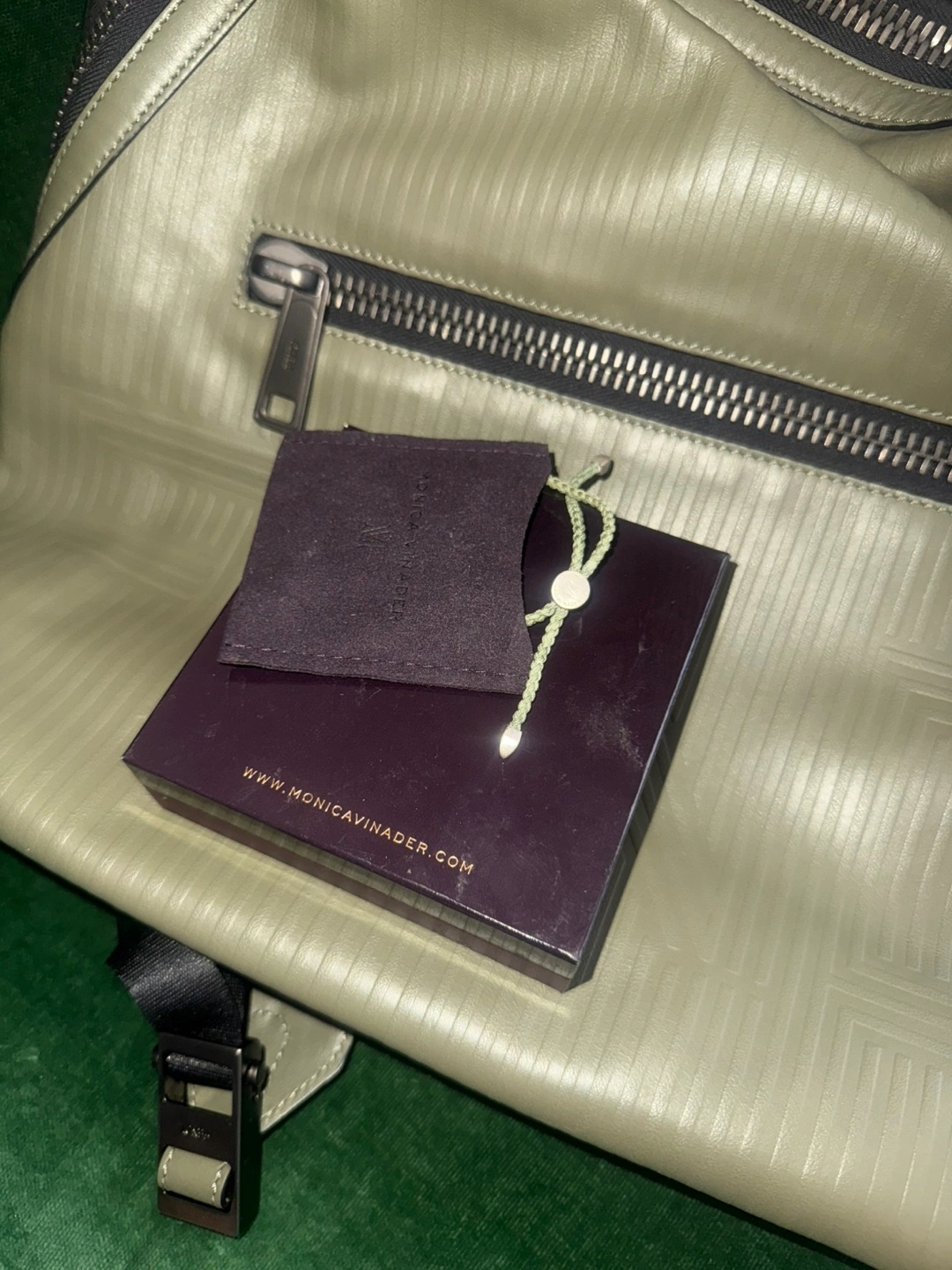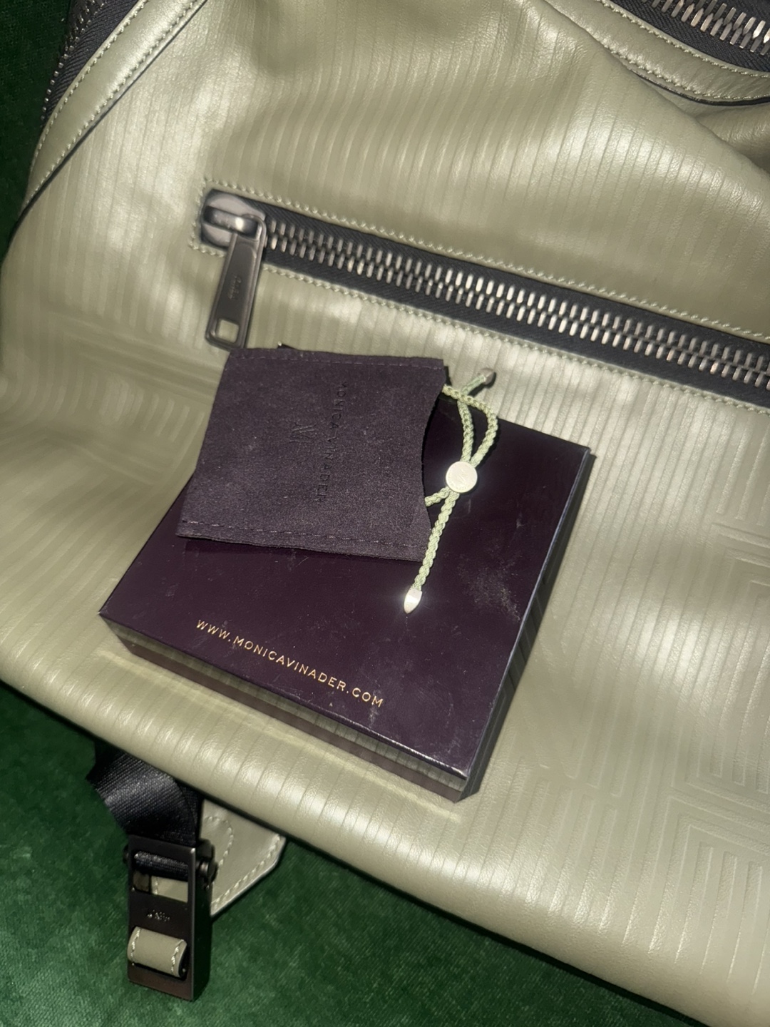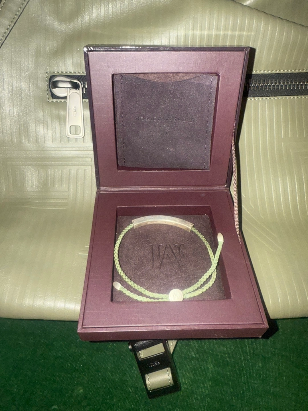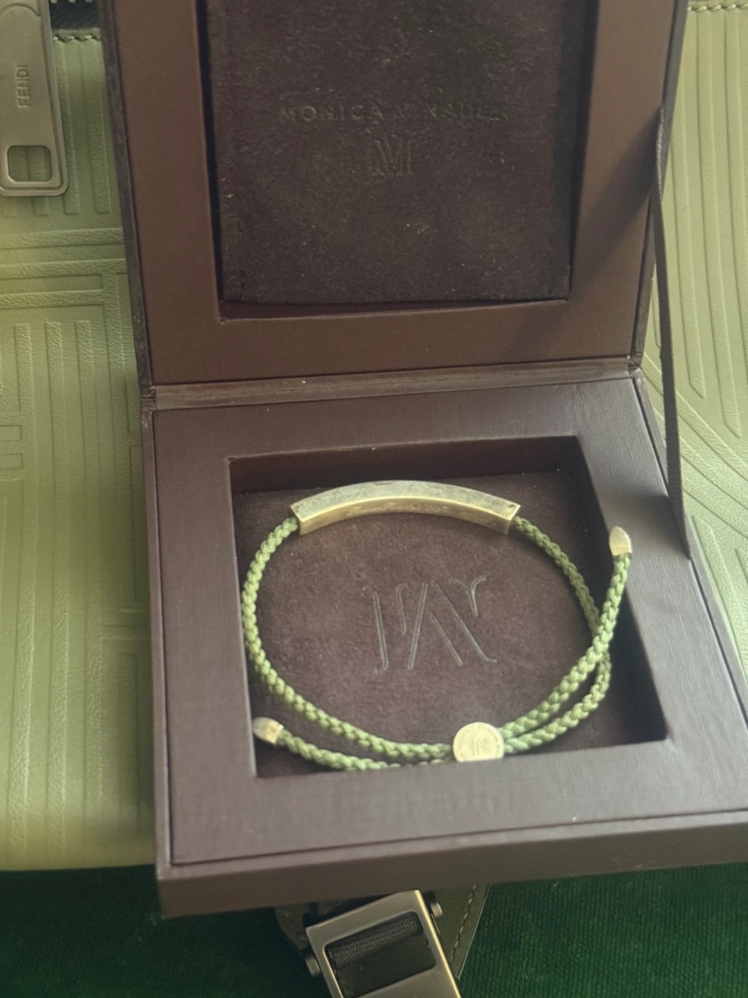 Selling a Monica Vinader linear friendship bracelet sterling silver with a green cord. It comes with its original box and pouch. Pick up from queens Elmhust