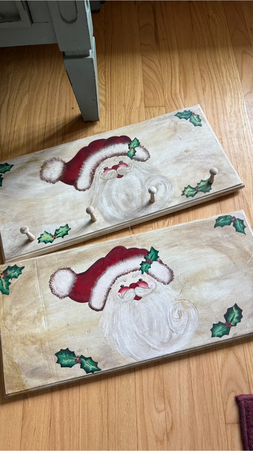 Selling two hand-painted Santa-themed coat racks! They're perfect for adding a touch of holiday cheer to your home. Each rack features a unique Santa design and sturdy pegs for hanging coats, hats, or scarves. They are in great condition and ready to bring some festive spirit to your entryway or any room!