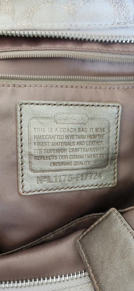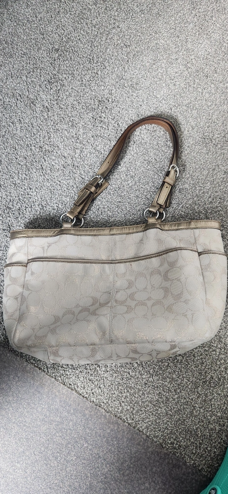 Selling a Coach handbag in neutral tones. It features the classic Coach pattern and a metallic trim. The interior is spacious with a zipper pocket. The bag shows some signs of wear but is still in good condition for everyday use