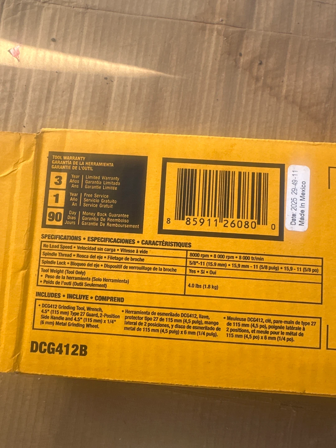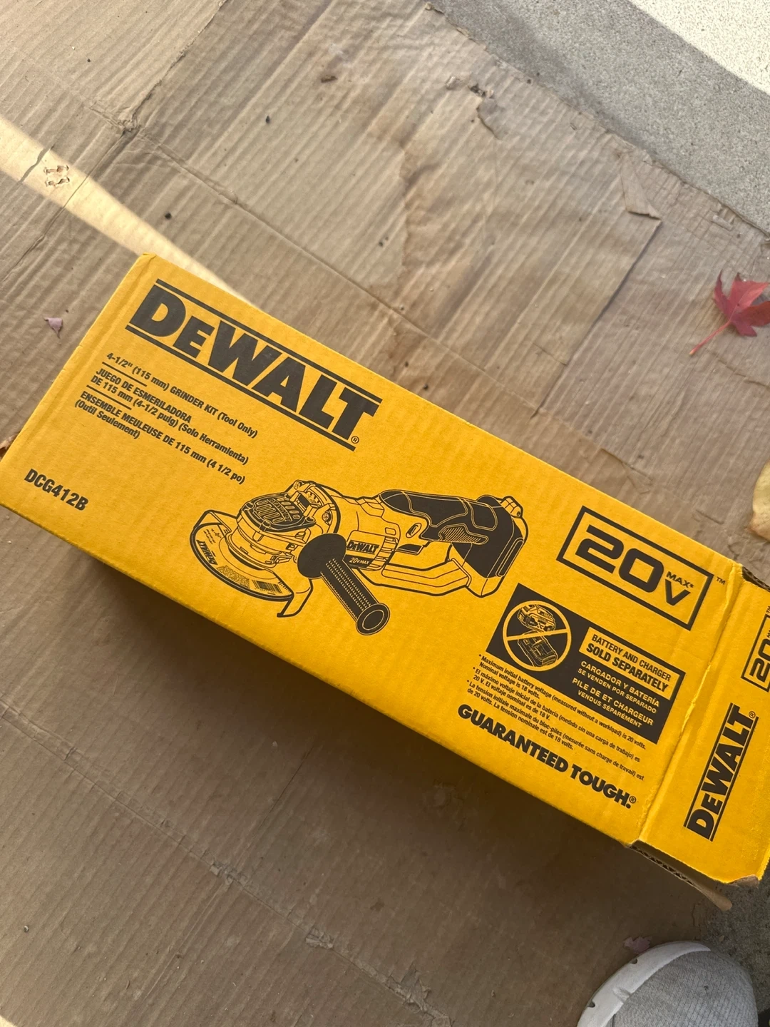Selling a DeWalt 20V MAX 4-1/2" (115 mm) Grinder Kit (Tool Only). This is model DCG412B and it's brand new in the box! Includes a 4.5" (115 mm) Type 27 Guard, a 2-Position Handle, and a 4.5" (115 mm) x 1/4" (6 mm) Metal Grinding Wheel